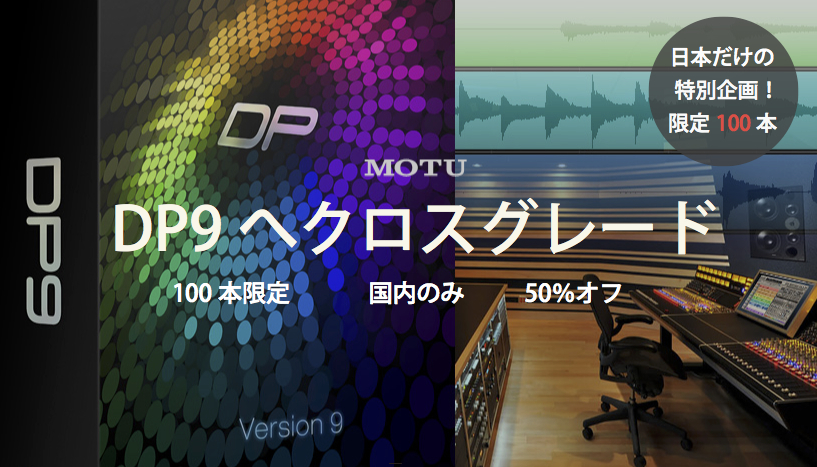 他社DAWユーザーを対象としたクロスグレードではありますが、すでに所有のDAWを手放すことなく、DP9を併用いただくなど、現状のシステムにアドオンいただく用途にもご使用いただけますので、この機会にDPへ世界に触れていただければ幸いです。
