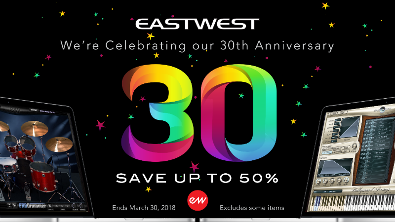 EastWest 30th アニバーサリーを記念して、ハイリゾリューションストアでは、EastWestダウンロード・製品を最大50%オフにてご提供するセールを実施いたします。