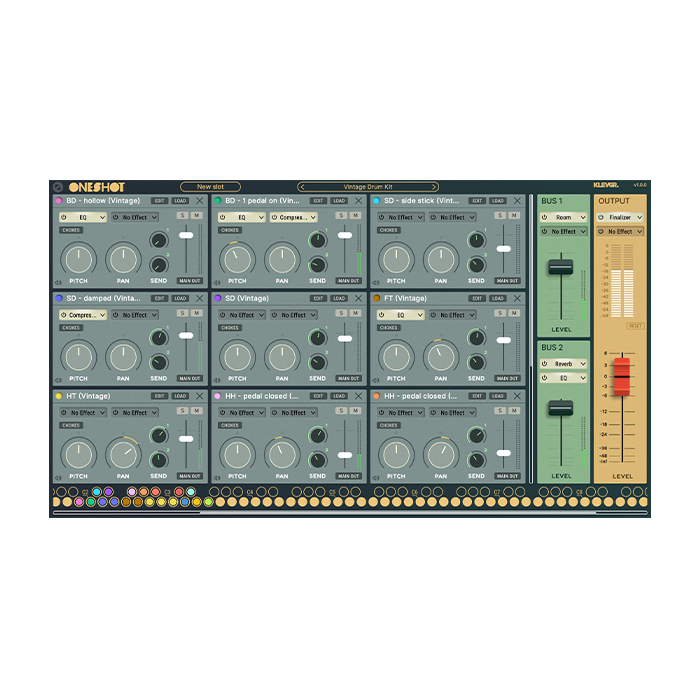 Klevgrandならではの高速ワークフローを提供するGUIと、ラウンドロビン、ヒューマナイズ、ベロシティレイヤリングやチョーク設定にも対応する新時代のドラムサンプラーOneShotに是非ご期待ください。