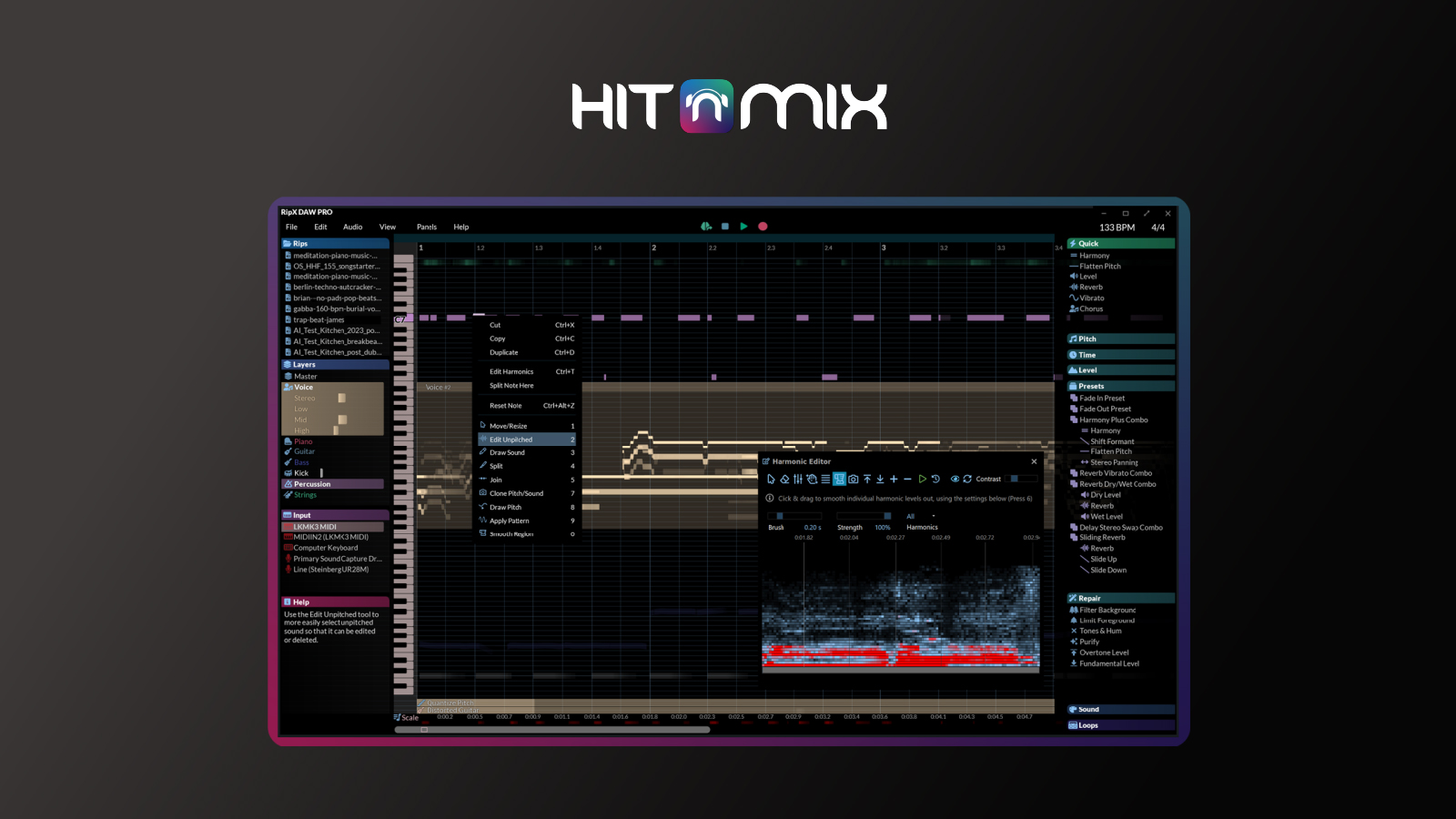| The RipX DAW パネル Rips Layers Quick Pitch Time Level Presets Input Sound Repair (PRO only) RipScripts (PRO only) Interactive Help オーディオ/ビデオの起動、リッピング、エクスポート オーディオの起動とリッピング Ripでの編集準備 オーディオの書き出し 映像のインポートとエクスポート (macOS only) カーソル、セレクション、グループ、エフェクト カーソル 音符と時間の選択 グループ 選択範囲にエフェクトを適用する オートメーションレーン プリセット & コンボ 編集に欠かせないステップ・バイ・ステップの手順 ピッチ ピッチをクロマチックに編集する スケールを編集する ピッチの微調整 ピッチを素早くフラットにしたり、スライドさせたり、一定のビブラートを加える リズム 音符の先頭を動かしてリズムを編集 音符の追加/削除によるリズムの編集 音符の長さ、テンポと時間 音符の長さを編集する テンポの編集 時間の編集 ボリューム & EQ アンピッチド・サウンド 再生、ループ、スケールのランダム化 再生 ループ スケールのランダム化 楽曲の学習と練習 音符のピッチ ギター・コードの記号とダイアグラム レコーディング、AI音楽生成、サンプルの使用 レコーディングの前に レコーディング ステップ・タイム・レコーディング 高度な入力設定 AI音楽生成 Soundパネル Loopsパネル |