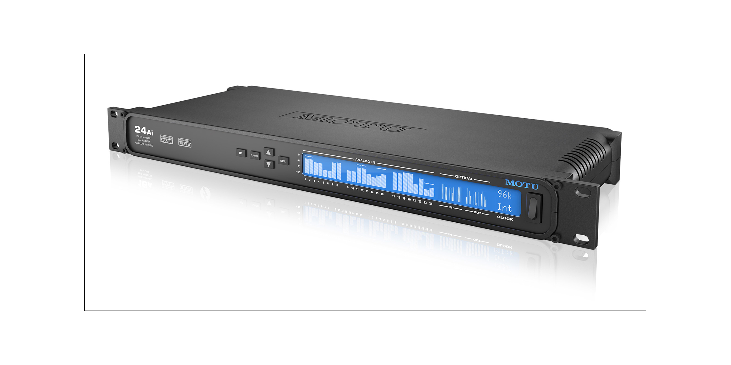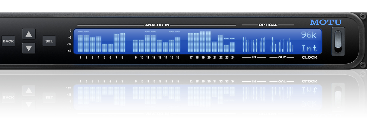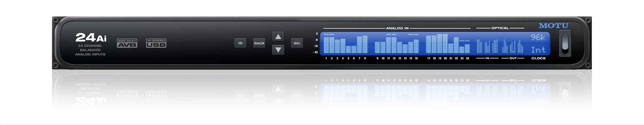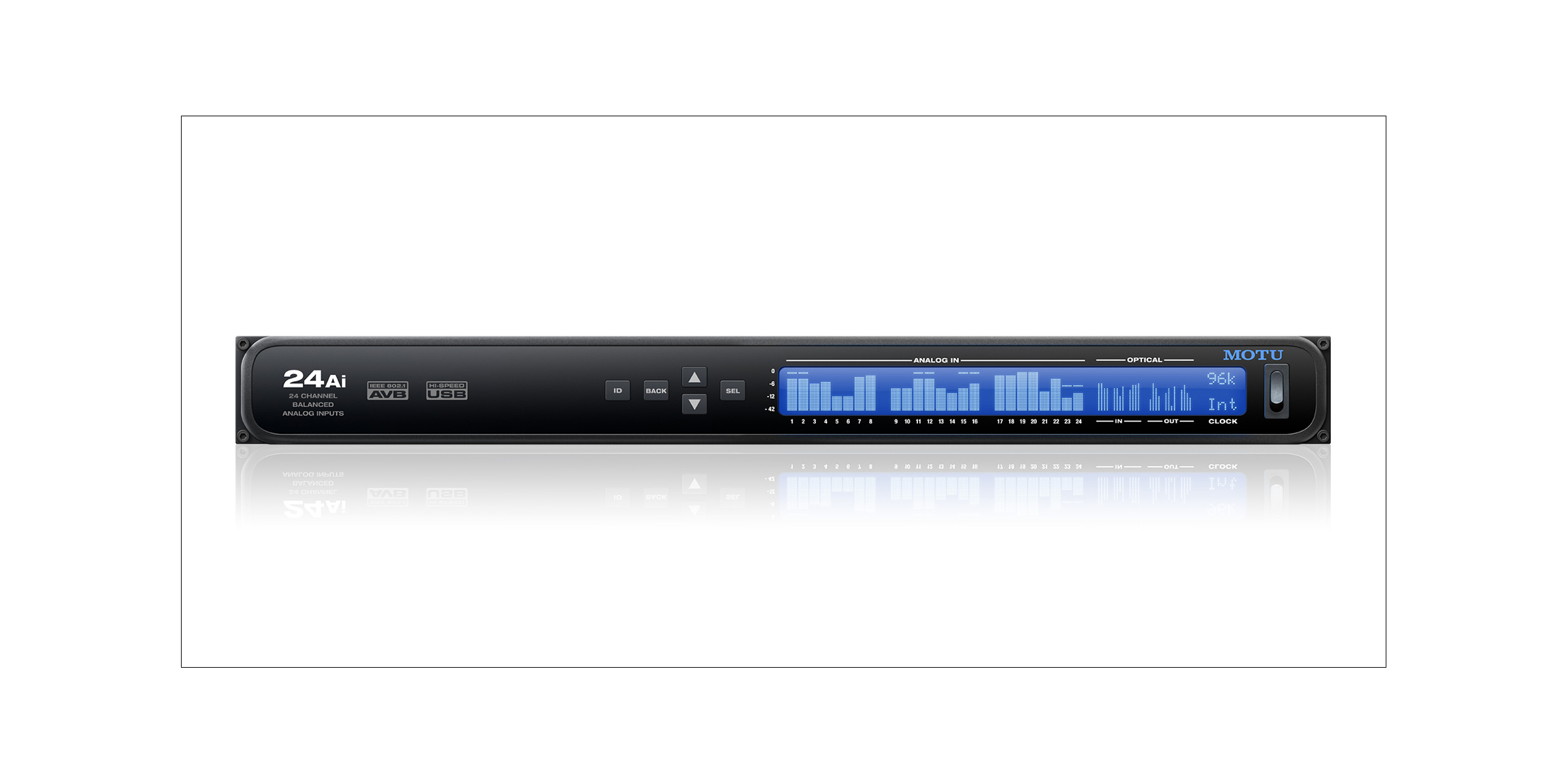 24Aiは大型バックライト付き324×24液晶ディスプレイを搭載し、全てのアナログ・デジタル入出力の信号の状態を一目で確認できます。また、シンプルで便利なメニューから、ハードウェアの設定も可能です。