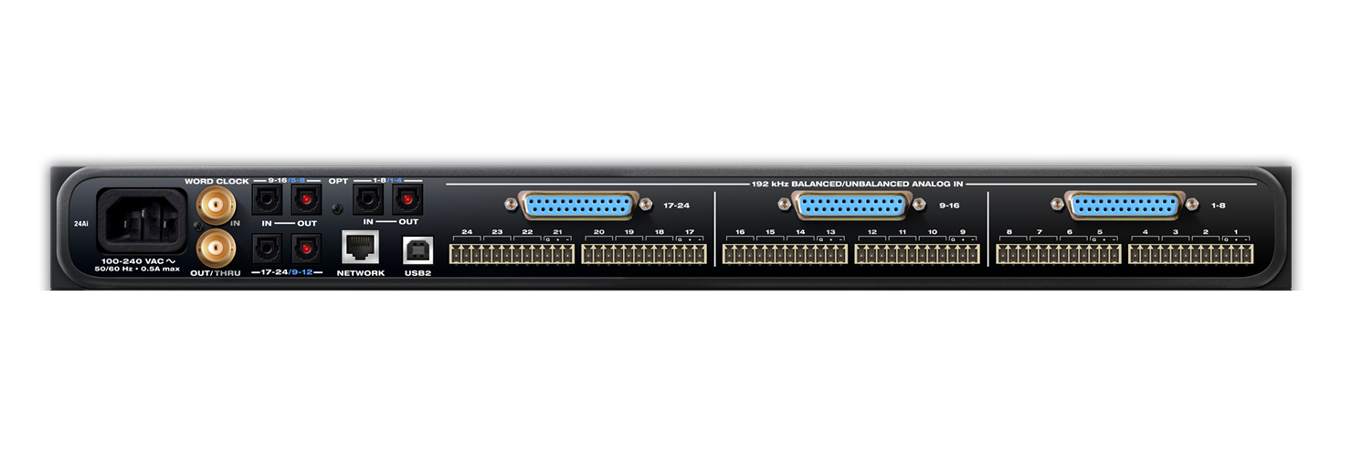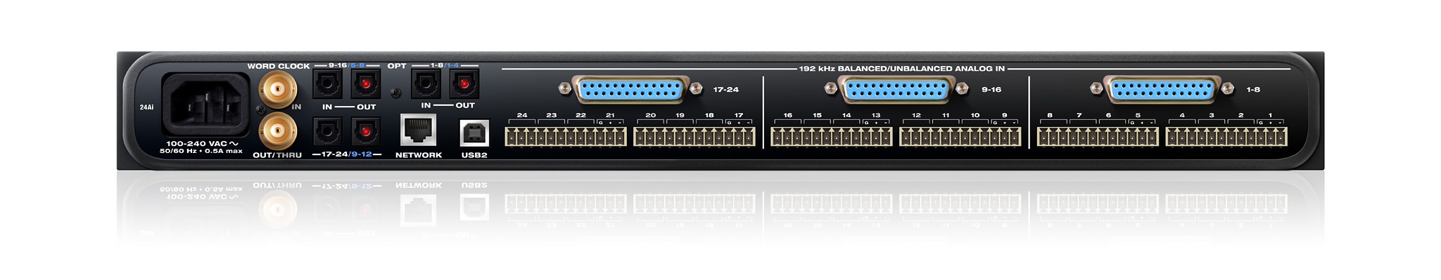 24Aiは24チャンネルのアナログ入力、さらにADATオプティカル入出力を3系統搭載し、合計72chの入出力をシステムに追加します。 アナログI/OはDB-25 D-sub端子とPhoenix端子(ユーロブロック)を採用。スタジオからインスタレーションまで、フレキシブルなワイヤリングが可能です。