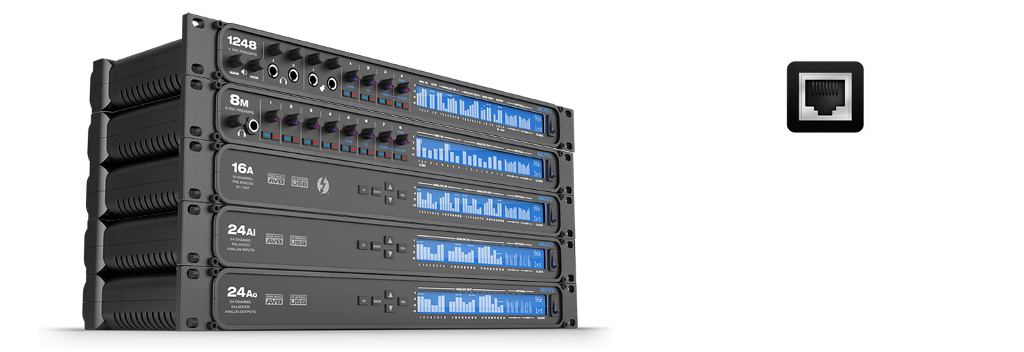 24Aiに搭載されたネットワークポートは、AVBイーサネット(IEEEによって開発されたオーディオネットワーキングのための新しいプロトコル)を導入しています。 CAT-5eあるいはCAT-6 イーサネットケーブルでMOTU AVBインターフェイス(24Ai、24Ao 、1248、8M、16A)を接続するだけで拡張が可能です。