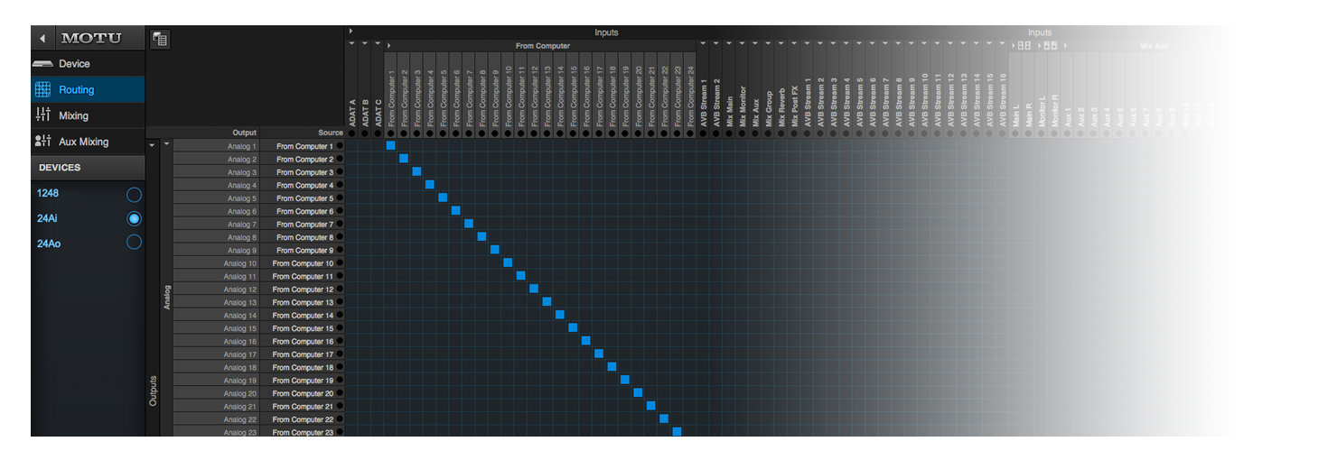 はい、AVBインターフェイスの各モデルはミキサーを搭載しています。48チャンネル*注1 & 12ステレオバス、そしてエフェクトまでも搭載しているほか、洗練されたGUIによるオーディオルーティングも可能です。 しかしながらコンピュータのI/Oとしてお使い頂く場合、ミキサーは必要ありません。Digital PerformerなどのDAW側からI/Oのルーティングを行うと、ミキサーを通らずにDAWとI/Oが直結されるようになります。