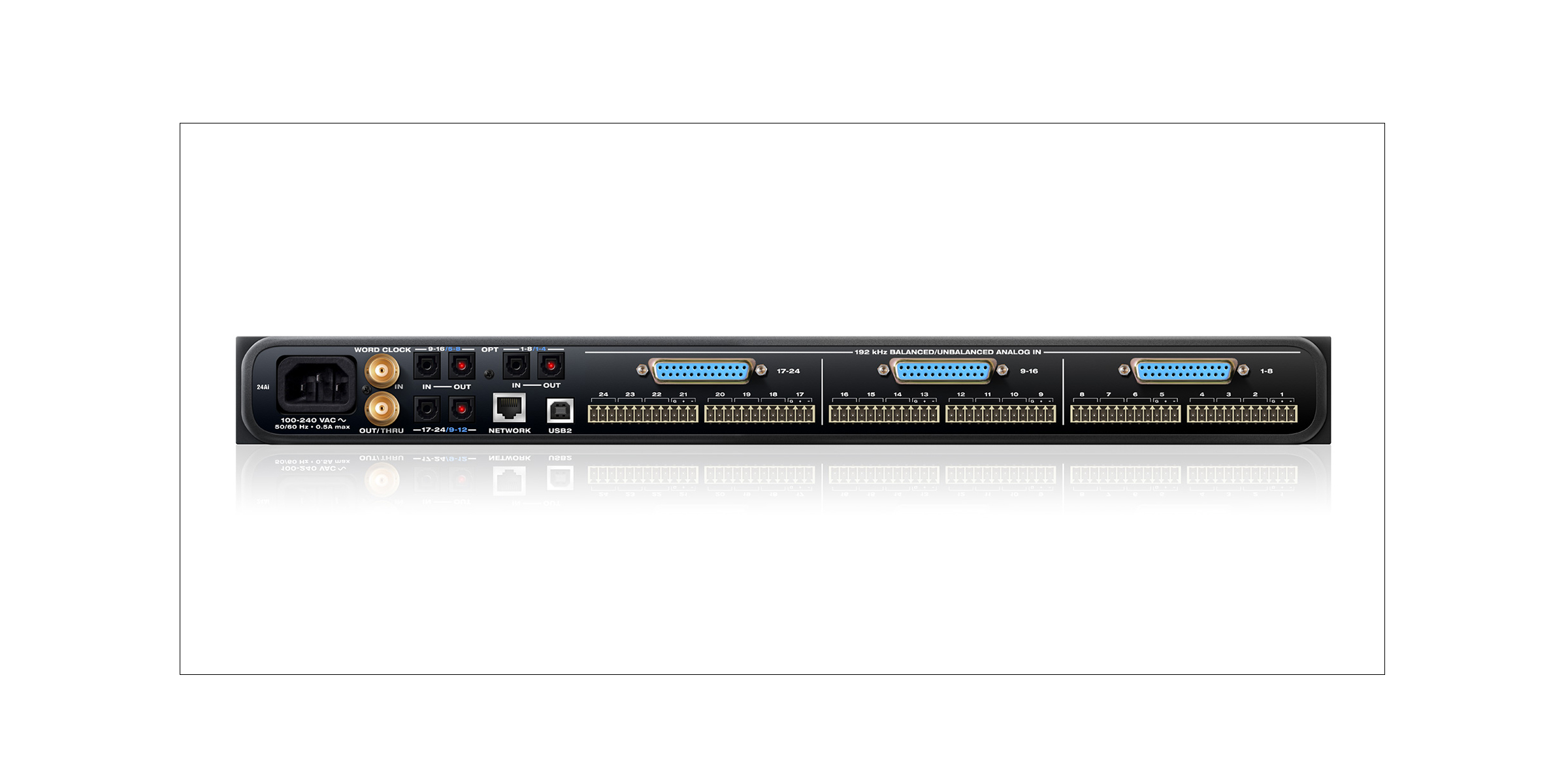 48x24入出力、アナログインx24 (D sub/ユーロブロック)、ADAT Optical x3 Word Clock In&Out、USB/AVBイーサネット接続