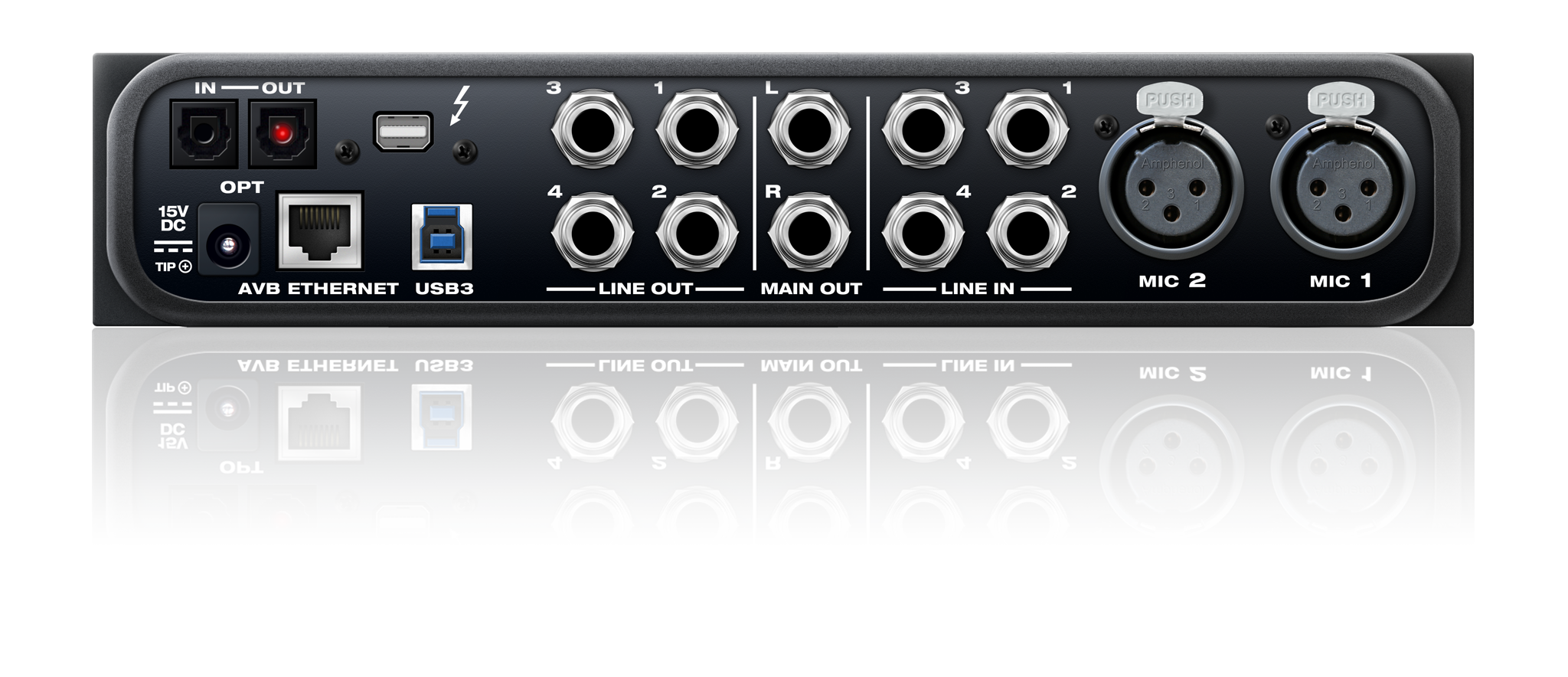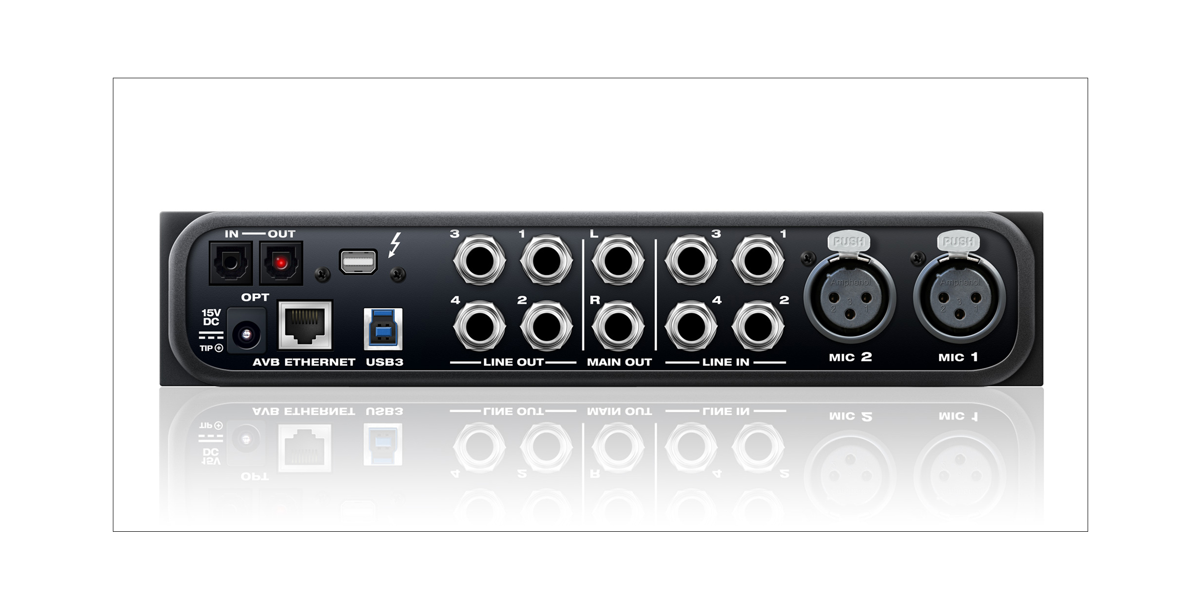 16x16入出力、マイクインx2、ギターインx2、ライン4x4、ADAT optical x1、Thunderbolt/USB 3.0/AVBイーサネット接続
