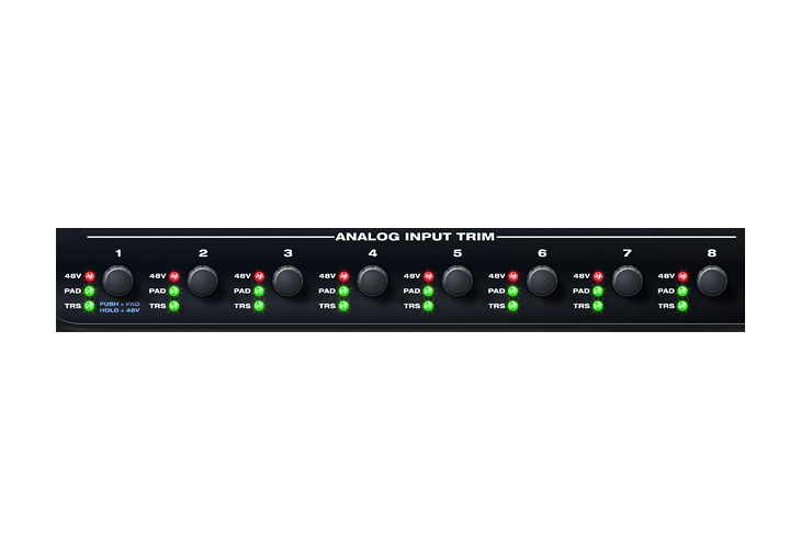 フロントアナログ入力はデジタルコントロールのアナログトリムで調整すると同時に、トリムツマミをを押すと20dBのアナログトリムを、長押しすると48vファンタム電源のON/OFFを設定できます。