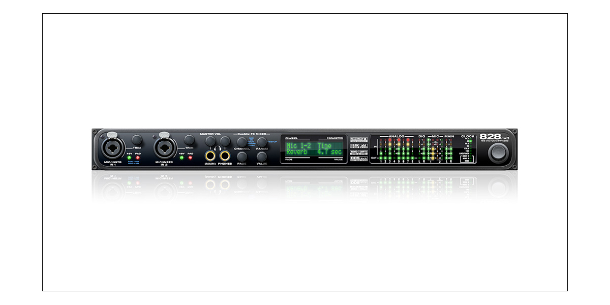 828mk3 Hybridは、ギターやマイクはもちろんのこと、シンセサイザーやキーボード、ドラムマシンからエフェクトプロセッサーやモニタースピーカーに至るまで、全ての機器を接続する事ができます。そしてこれらをオンボードDSPデジタルミキサー”CueMix FX”でルーティングやミキシングを行う事ができます。