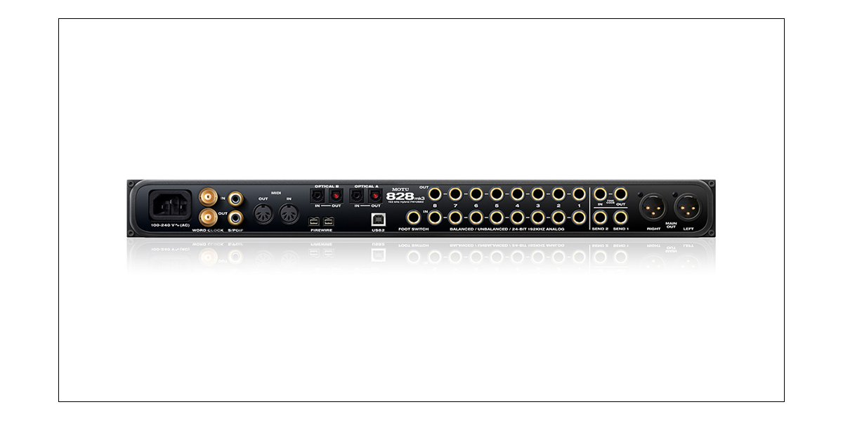 MacintoshFireWireもしくはUSB2端子WindowsFireWireもしくはUSB2端子互換ソフトウエア(Mac OS X)828mk3 Hybridは、Macintosh標準のCore Audio driverと、Core Audio Driverに対応した以下のソフトウエアで動作します。 MOTU Digital Performer MOTU AudioDesk Avid Pro Tools( バージョン9以降) Apple Logic Pro Apple Logic Express Apple Garage Band Apple SoundTrack Pro Ableton Live Propellerhead Record&Reason Steinberg Cubase Native Instruments Kontakt互換性ソフトウェア(Windows)828mk3 Hybridは、Windows 7/ Vista / XPの標準オーディオドライバ及びASIOドライバと、それらに対応した以下のソフトで動作します。 Ableton Live Avid Pro Tools( バージョン9以降) Cakewalk Sonar Steinberg Cubase Propellerhead Record & Reason Image Line FL Studio Sony Vegas Pro Sony Sound Forge Sony Acid Native Instruments Kontakt -