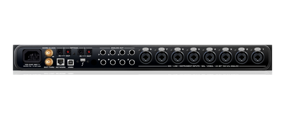 対応サンプルレート44.1, 48, 88.2, 96, 176.4, 192 kHzマイク/ライン 入力8 x XLR/TRS "コンボスタイル" 入力 プリアンプゲイン:0 to +63 dB (デジタル制御)アナログ出力8 x 1/4" TRS ライン出力 (バランス, DC カップル) 最大レベル:+20 dBu (デジタル調整可能 -4 to +20) 2 x 1/4"TRS ステレオヘッドホンアウトデジタル I/O2 バンク (16 ch) の ADAT オプティカル で 1x サンプルレート 2 バンク (8 ch) の SMUX オプティカル で 2x サンプルレート 切替え可能なステレオ TOSLink (オプティカル S/PDIF)※オプティカルAポートのみ切り替え可能 1 x ステレオ S/PDIF on RCA (96 kHz まで)トータル I/O24 入力 / 28 出力 (合計 52) 1x サンプルレート 16 入力 / 20 出力 (合計 36) 2x サンプルレート 8 入力 / 12 出力 (合計 20) 4x サンプルレートコンピュータ I/O1 x Thunderbolt 1 (Mac 及び Win) Thunderbolt 2 & 3 互換 1 x USB 2.0 標準ドライバで動作可能 USB 3.0 & iOS 互換コンピュータ I/O チャンネル Thunderbolt128 入力/出力:1x or 2x (44.1 to 96 kHz) 64 入力/出力:4x (176.4 to 192 kHz)コンピュータ I/O チャンネル USB64 入力/出力:1x (44.1 to 48 kHz) 32 入力/出力:2x (88.2 to 96 kHz) 24 入力/出力:4x (176.4 to 192 kHz)同期 I/O1 x BNC:ワードクロック 入力/出力ネットワーク I/O1 x RJ45 AVB/TSN Ethernet (1 Gbps)AVBストリーム数(1ストリームにつき8ch使用可)4 in / 4 out @ 44.1 or 48 kHz 4 in / 4 out @ 88.2 or 96 kHz 2 in / 2 out @ 176.4 or 192 kHzヘッドフォン2 x 1/4" TRS ステレオフォン (選択式)ファンタム電源8 x individual +48Vフロントパネル2 x 1/4" TRS ヘッドフォン出力 2 x デジタルロータリーエンコーダ(Phoneレベル) 4 x デジタルロータリーエンコーダー • マイクプリアンプゲイン 2 x 大型 デジタルロータリーエンコーダー • メインボリューム / メニュー 8 x 小型スイッチ • (2) Pad / (2) 48V ファンタム電源 10 x 大型スイッチ • メニューナビゲーション / A/B モノセレクトなど 2 x LCD (128 x 160) レベルメーター / メニューナビゲーション電源仕様100 - 240V 50 - 60 Hz ・0.5A max スイッチング電源寸法と重量19 x 7 x 1.75 インチ 48.3 x 17.75 x 4.5 cm 1.9 kgMac 動作環境1 GHz以上の Intelプロセッサ 2 GB以上のメモリ(4 GB以上を推奨) Mac OS X version 10.8 以降 Thunderbolt 1/2/3もしくはUSB 2/3、AVB/TSN Ethernet ポート *AVB/TSN イーサネットオーディオインターフェイスはOS X El Capitan以降が必要です。Windows 動作環境1 GHz Pentium プロセッサ以上 2 GB以上のメモリ(4 GB以上を推奨) Windows 7, 8 もしくは 10 Thunderbolt 1/2/3もしくはUSB 2/3 ポートWeb アプリサポートクライアントプラットフォーム:Mac, Windows, Linux, iOS, Android ウェブブラウザ:Safari, Firefox, Chrome, Opera, Explorerなどソフトウェア(ダウンロード入手)Thunderbolt と USB 2.0 ドライバ MOTU Discovery App for Mac & PC MOTU Discovery App for iOS (Apple App Storeからダウンロード) MOTU Pro Audio Control web app MOTU Audio Tools (FFT, oscilloscope, X-Y plot, phase analyzer) AudioDesk for Mac & Windows (別途ダウンロードにて提供されます)オペレーティングシステムコンピュータオーディオ用:I/O: Mac OS X 10.8 以降 / Windows 7 以降 Webアプリケーションコントロール用:Mac, Windows, Linux, iOS, Android
