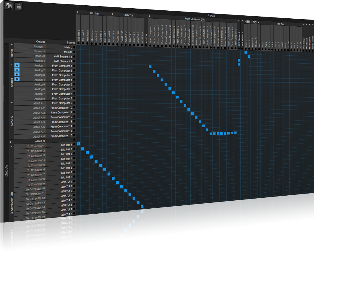 24x28入出力 マイク&TRSコンボx8 ラインアウトx8 S/P DIF、ADAT、トークバックマイク内蔵 ESS SABRE 32 DAC搭載 Thunderbolt / USB2.0 / AVB オーディオインターフェイス DSPミキサー・コンバータ