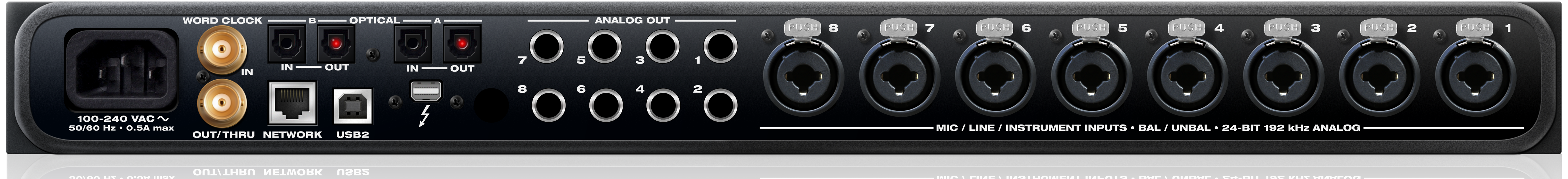 8個のマイクプリアンプは、-108 dBのTHD + N、118 dBのダイナミックレンジ、-129 dBuのEINパフォーマンスを実現します。各マイクチャンネルには個別のプリアンプゲイン、パッド、48Vファンタム電源、デジタルリモコンがあります。