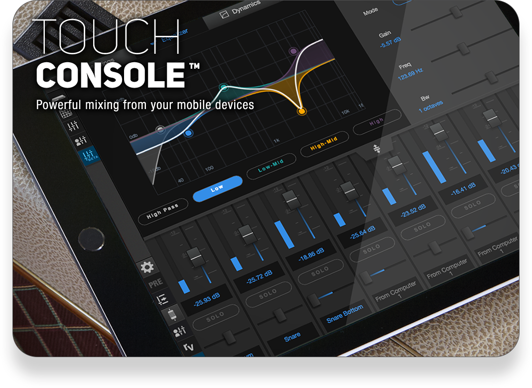 タッチスクリーン操作のために特別に設計されたTouch Consoleは、まったく新しいミキシング操作を提供します。タブレットやスマートフォンから、Touch Consoleにアクセスして、48チャンネルミキサーとエフェクトの操作を体感してください。タップ、スワイプ、ピンチ、そしてマルチタッチに対応し、誤作動を防ぐための特別なレイアウトが採用されたTouch Consoleはタブレットやスマートフォンで完璧なミキシングをもたらします。