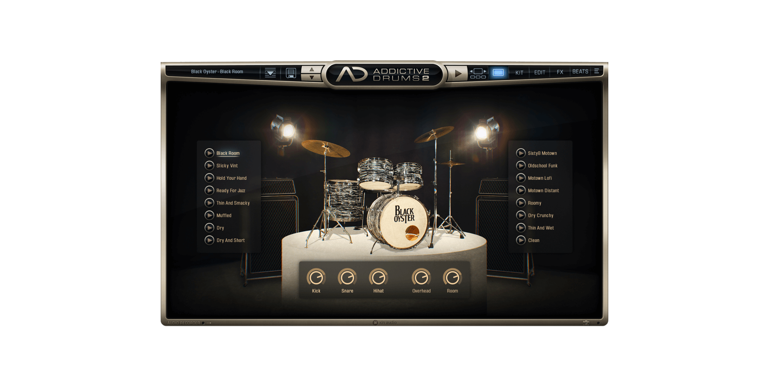 このドラムキットは、ストックホルムのサウンドトレードスタジオ・スタジオ301の大きな部屋で、クリーンかつクリアに録音され、さまざまなプリセットで好みのサウンドに調整できます。