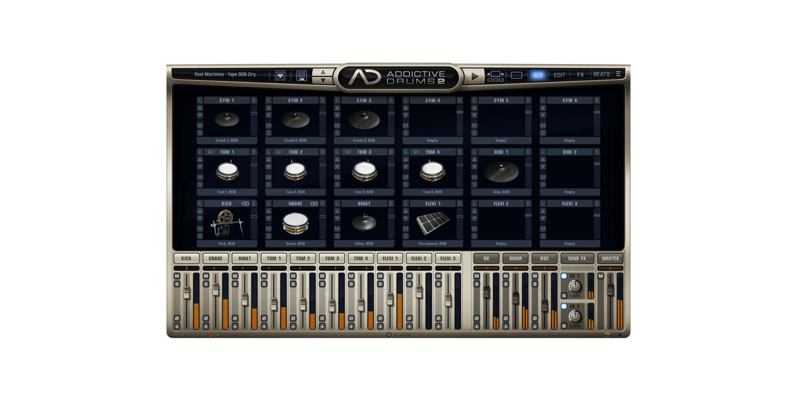 ミキサー画面上のフェーダーは、Addictive Drums 2のマイクの音量をコントロールします。ライドとシンバルは、個々のマイクはなく、オーバヘッドマイクとルームマイクを通じて、ミキシングされるため、ミキサー画面に表示がありません。 しかしながら、個々のキットピースでそれぞれの音量が設定できますので、これらのシンバルの音量設定と、オーバヘッド/ルームマイクの設定で、かなりシンバルに近接した設定が可能です。