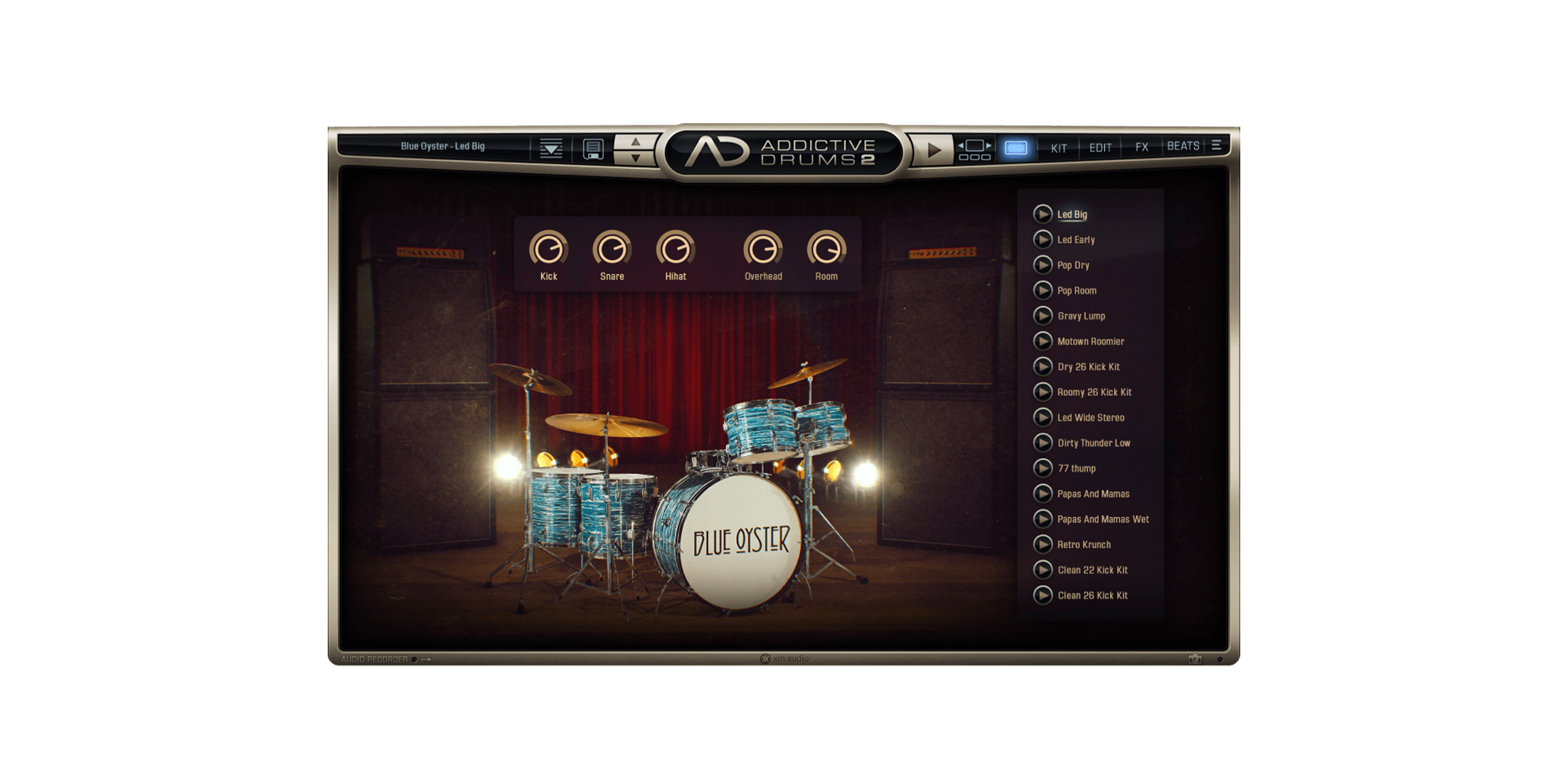 Blue Oysterは、Led Zeppelin のドラマー John Bonham のようなドラムサウンドを得るために、Ludwig Blue Oysterドラムキットで収録されています。さらにBlue Oysterは、ヴィンテージから現代的なサウンドまで、簡単にアクセスできる30のプリセットを搭載しています。