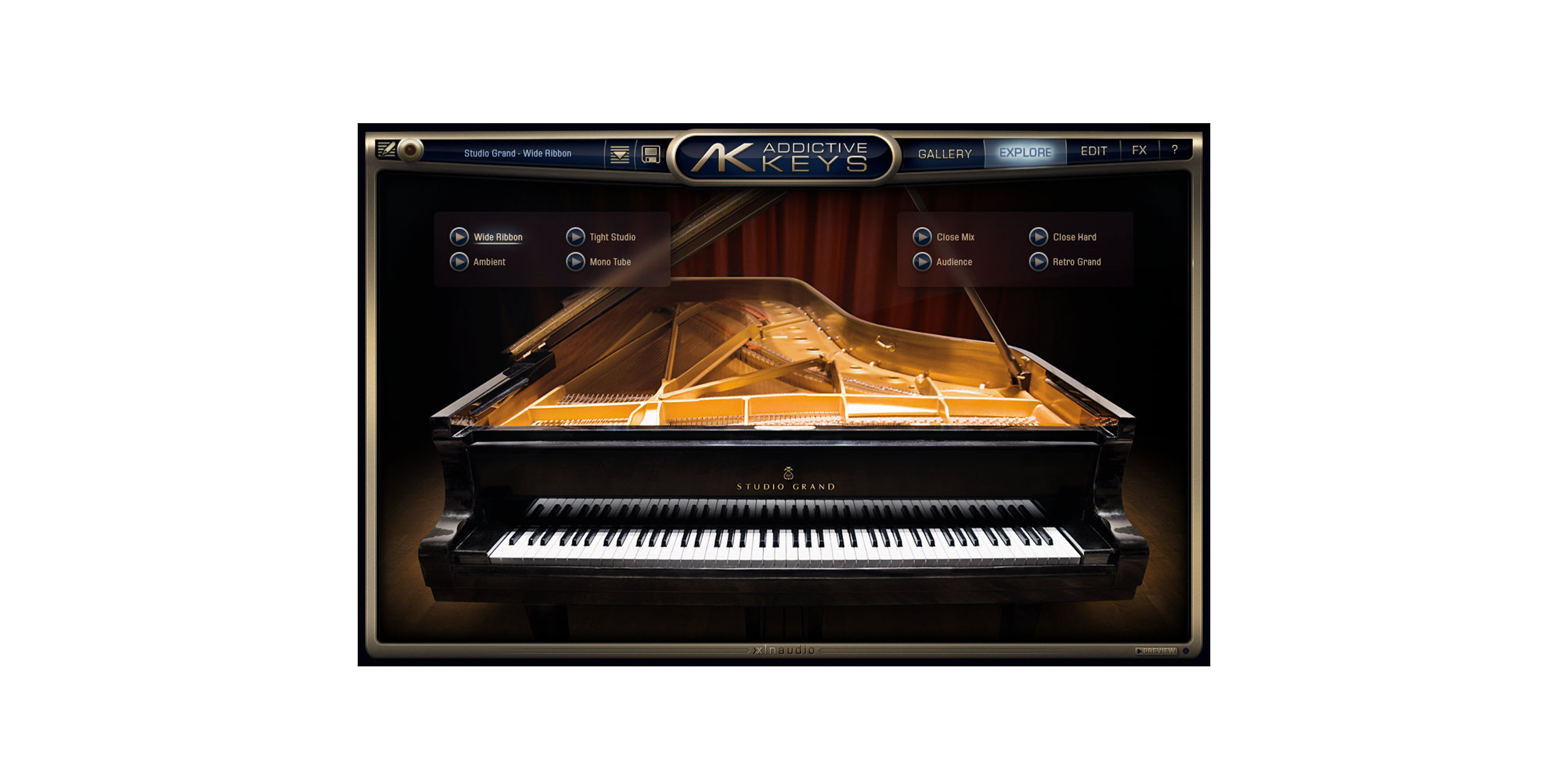 Studio Grandは伝統的なSteinway Model D コンサートグランドピアノの音色にフューチャーしています。Steinwayのピアノは、その持ち味と比類なき音色から、多くのピアニストに愛されています。Studio Grandに搭載されている ’ExploreMaps’ には、基本的なものから加工されたもの、一風変わった音までさまざまな種類のプリセットが入っています。バラエティーに富んだ音色の数々は、制作はもちろんステージ上でのライブにおいても完璧なパフォーマンスを生み出します。