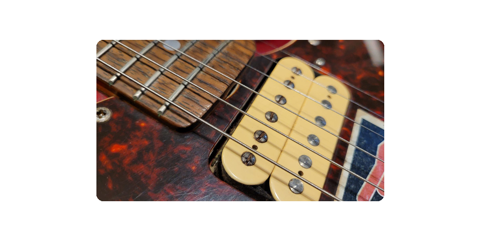 Duane Eddyに憧れて約10年前に購入したDan Electroバリトンエレクトリック。実際には想定していなかったほど用途が広く、ダウンチューニングされているメタル・ミュージックに最適です。 M-Tron Proバージョンとしては、Eddie VanHalenよりもDuane Eddyスタイルです。