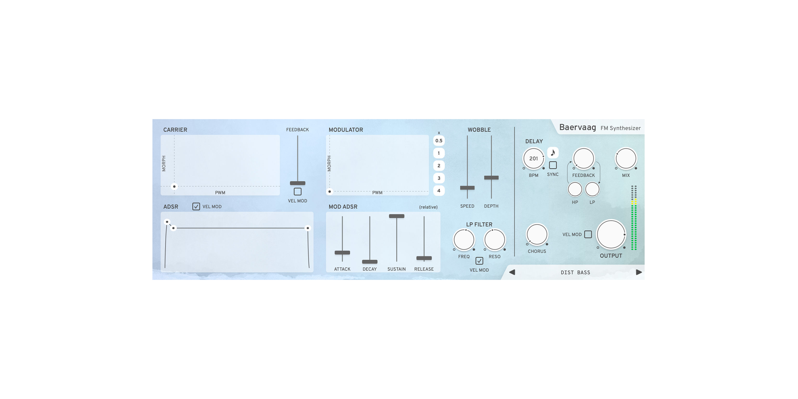 Baervaagは、1つのキャリア、1つのモジュレーターを備えたシンプルなFMシンセサイザーです。オシレーターのウェーブは、PWM(パルス幅モジュレーション)を使用して正弦波から純粋な方形波にシームレスに変更することができます。