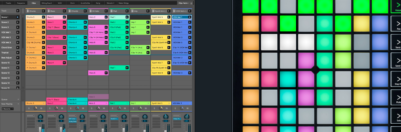 個々のクリップ、あるいはシーン全体(曲のセクション)をデバイスからトリガーするほか、フィルタースイープやその他のエフェクト処理を自由に適用できます。