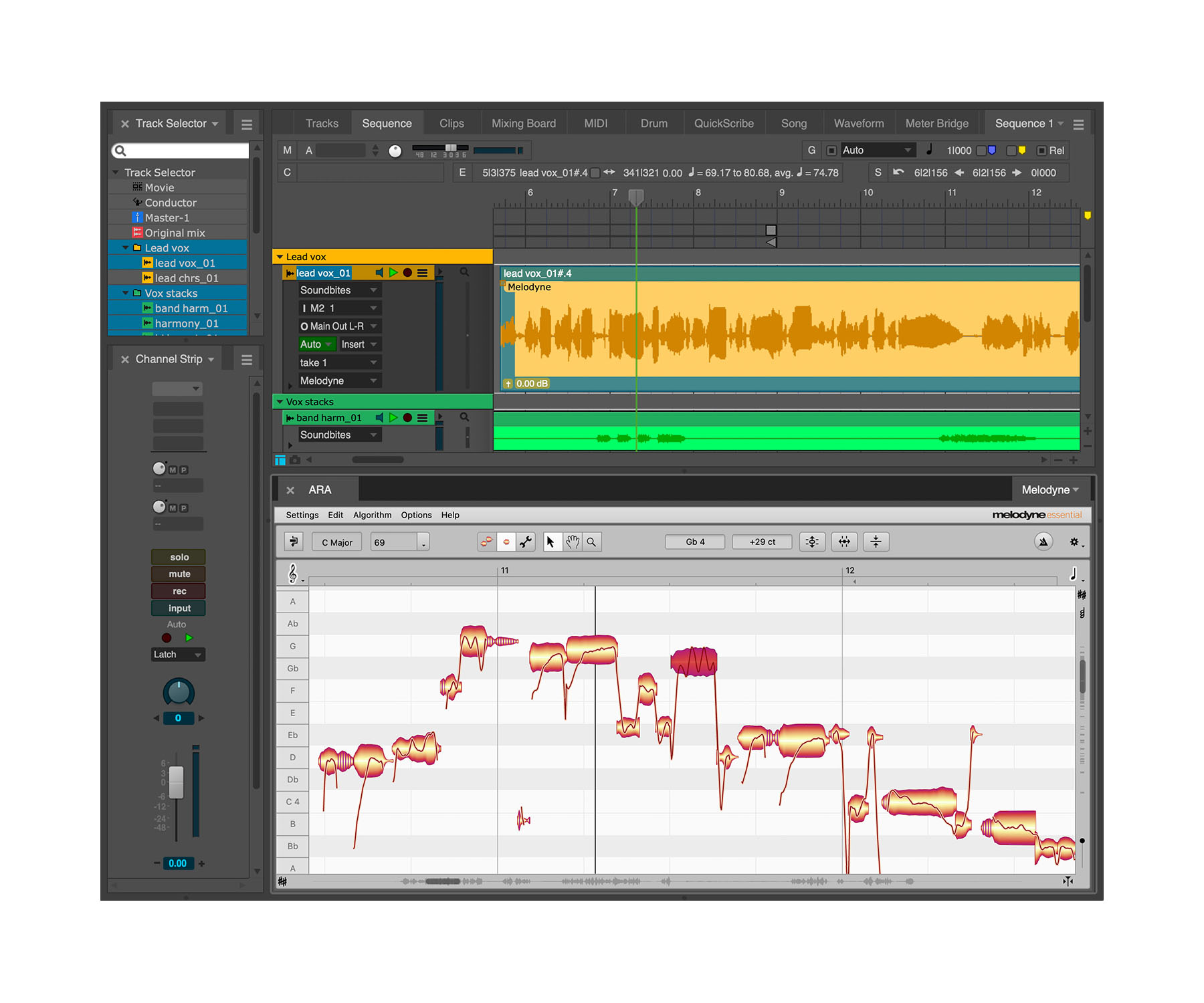 Melodyne のプロセッシングを活用し、ボーカルを含む様々なのトラックをプロダクションのコンテキスト内で直接アプローチします。また、Melodyne 5 Essential™から上位グレード版へアップグレードして、さらに高度な編集へステップアップすることも可能です。
