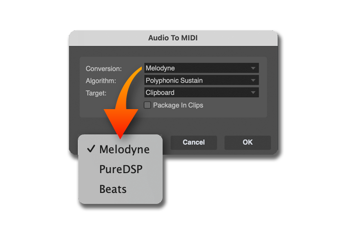ピッチを含むオーディオデータや、パーカッシブなオーディオ素材 、またはドラムループなどのデータを MIDI ノートに変換するオーディオ – MIDI 変換機能がアップデートしました。MIDIへのコンバートがアップデートしたことにより、Mオリジナルのオーディオを MIDI インストゥルメントやDP が誇るパワフルなMIDI編集であらゆるアレンジを加えられるます。この変換機能には、モノフォニック、ポリフォニック、パーカッシブなオーディオ素材に適した複数のアルゴリズムが用意されています。