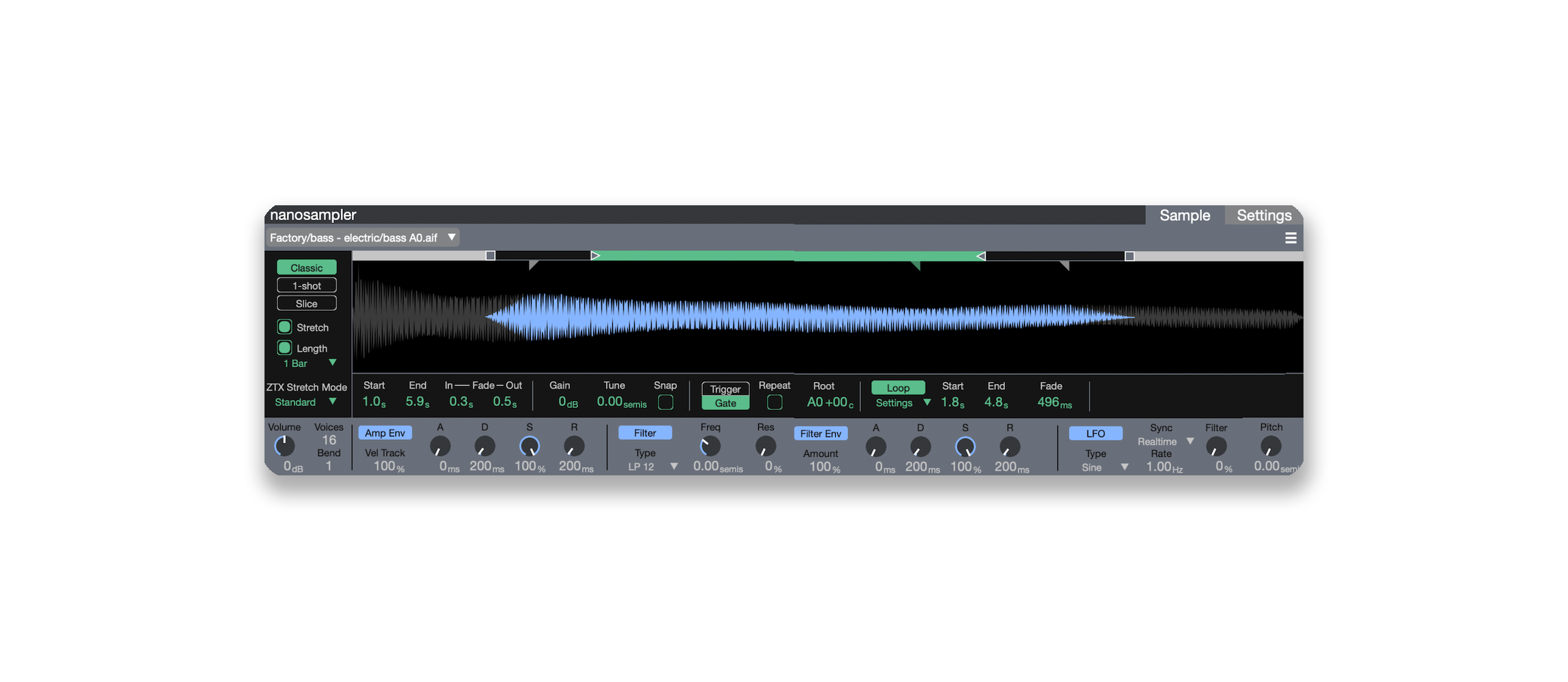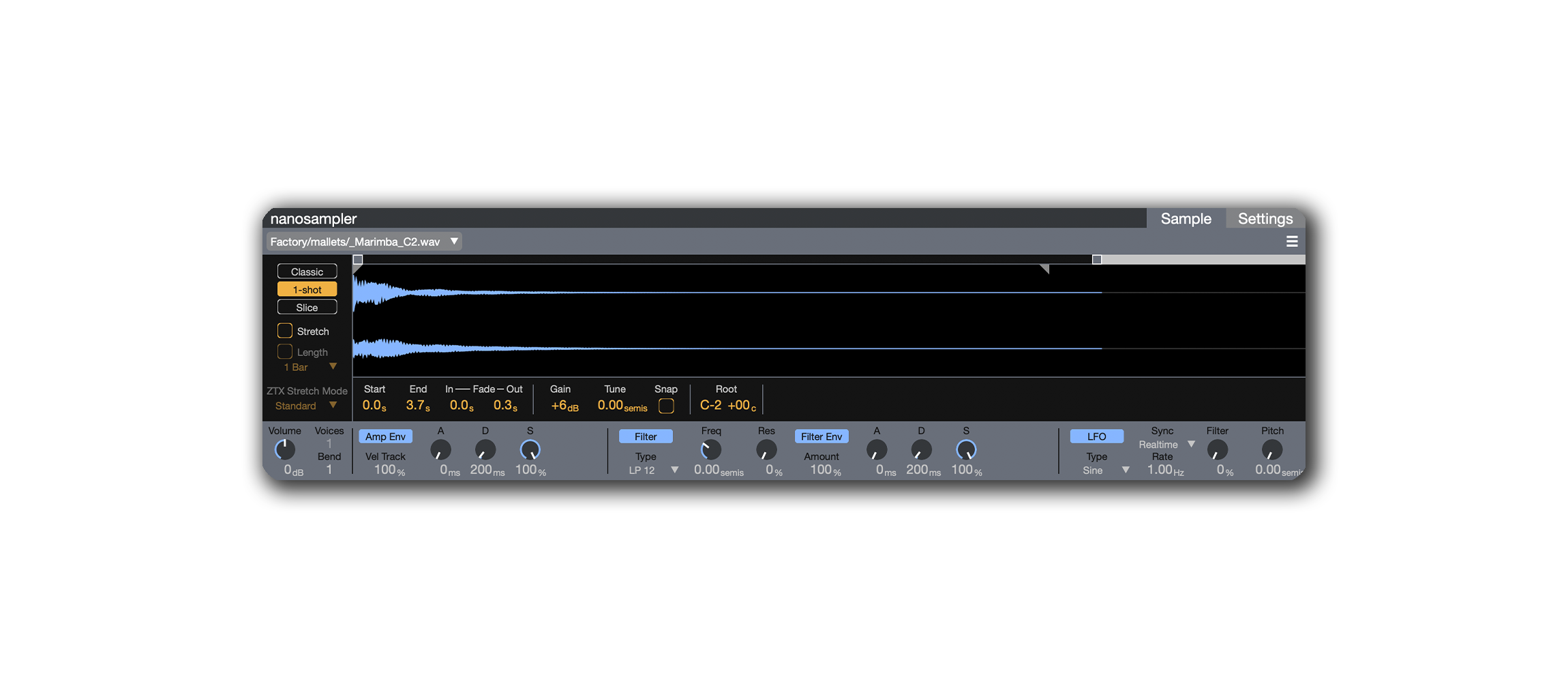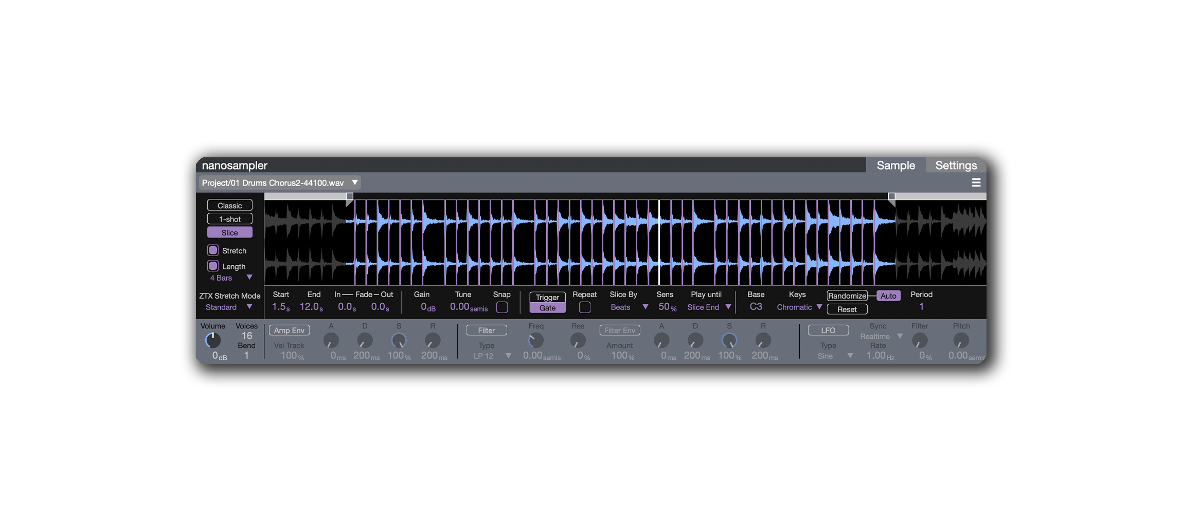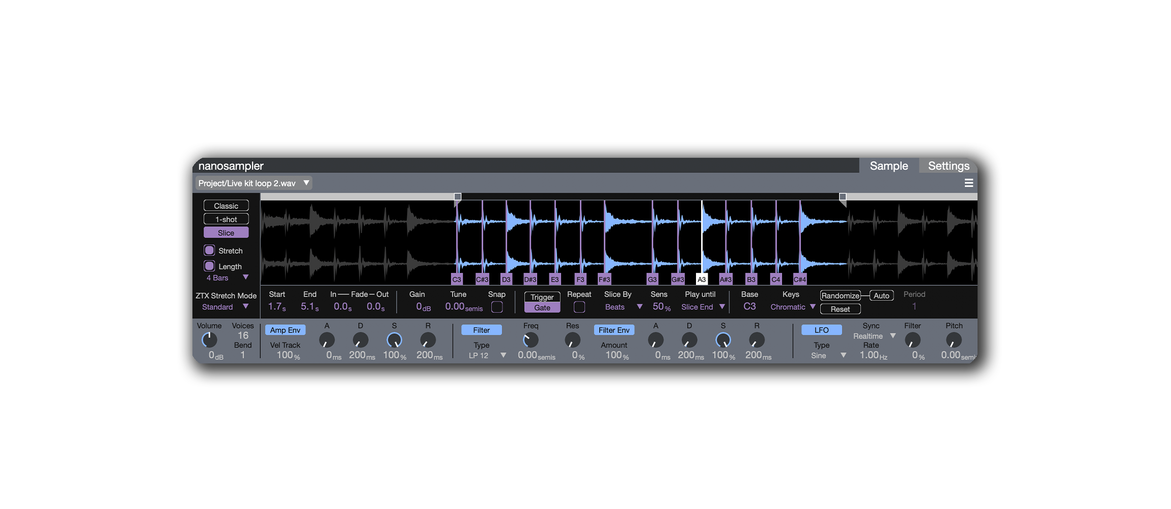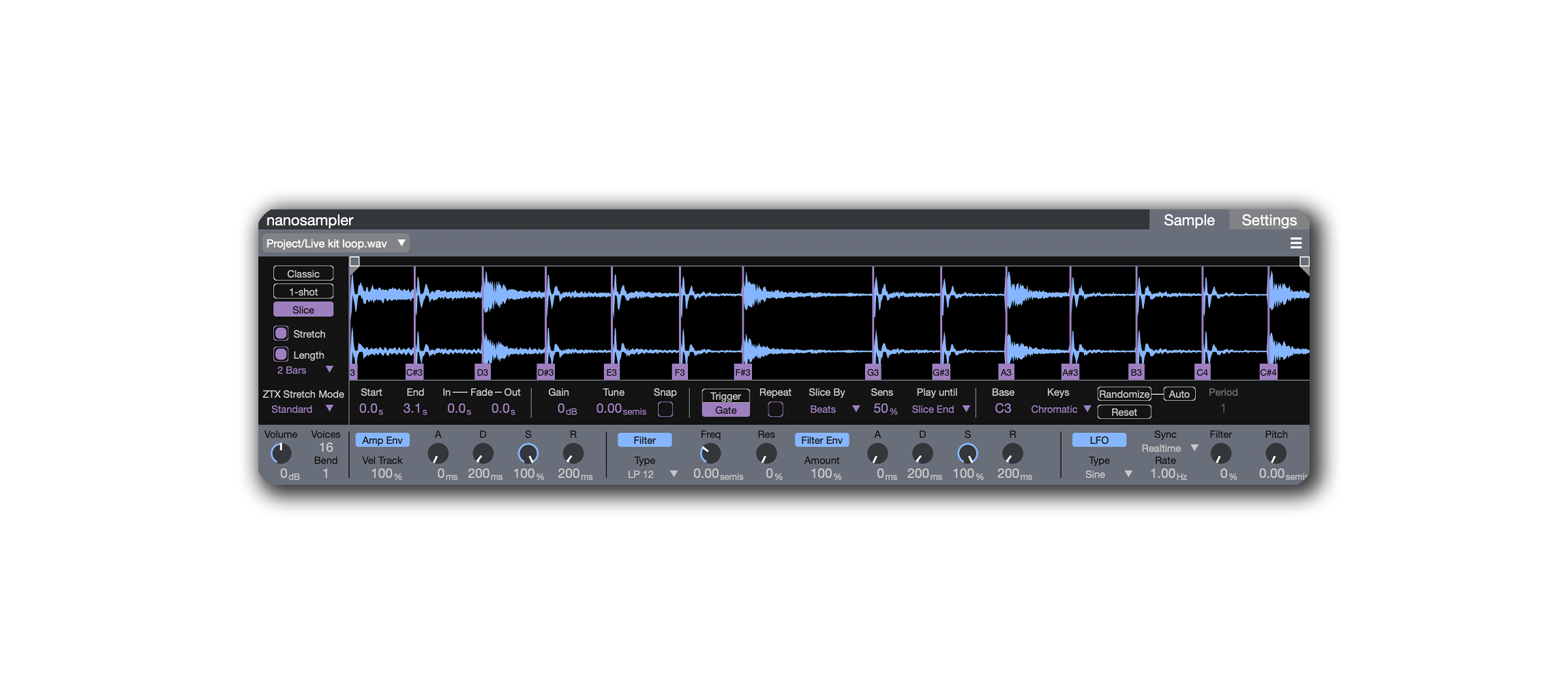 お好みのサンプルをドロップして、オーディオをストレッチ、スライス、ランダマイズして柔軟なサンプリングに対応することはもちろん、想像できる、あらゆるサウンドや楽器の音色を奏でます。