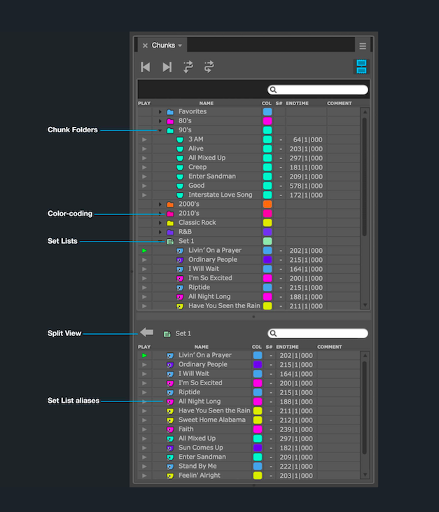 DP11では、チャンクをフォルダーとプレイリストに整理できるようになりました。フォルダはチャンクを整理するのに最適で、プレイリストは次のライブショーのセットリストとして完全に機能します。