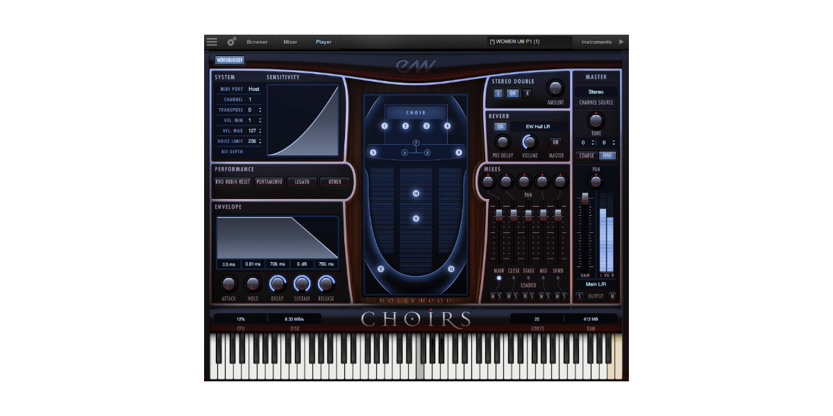 - HOLLYWOOD CHOIRのDiamond Editionには、メイン、クローズ、ステージ、ミッド、サラウンドの5つのマイクミックスを備えた約59 GBの24ビット、44.1 kHzサンプルが含まれています。