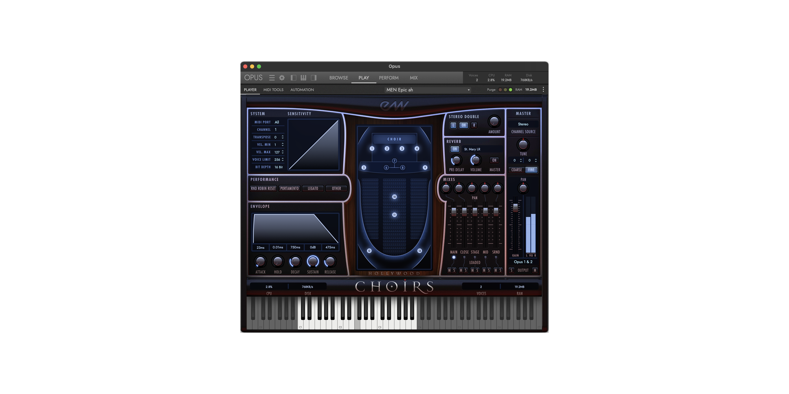 Hollywood Choirsは男性と女性の複合セクションで録音されており、重なっている範囲を利用することで、合唱団の総合力を高めることができます。追加の利点として、これによりWordBuilderを2種類のボイスタイプで設定することがはるかに簡単になります。