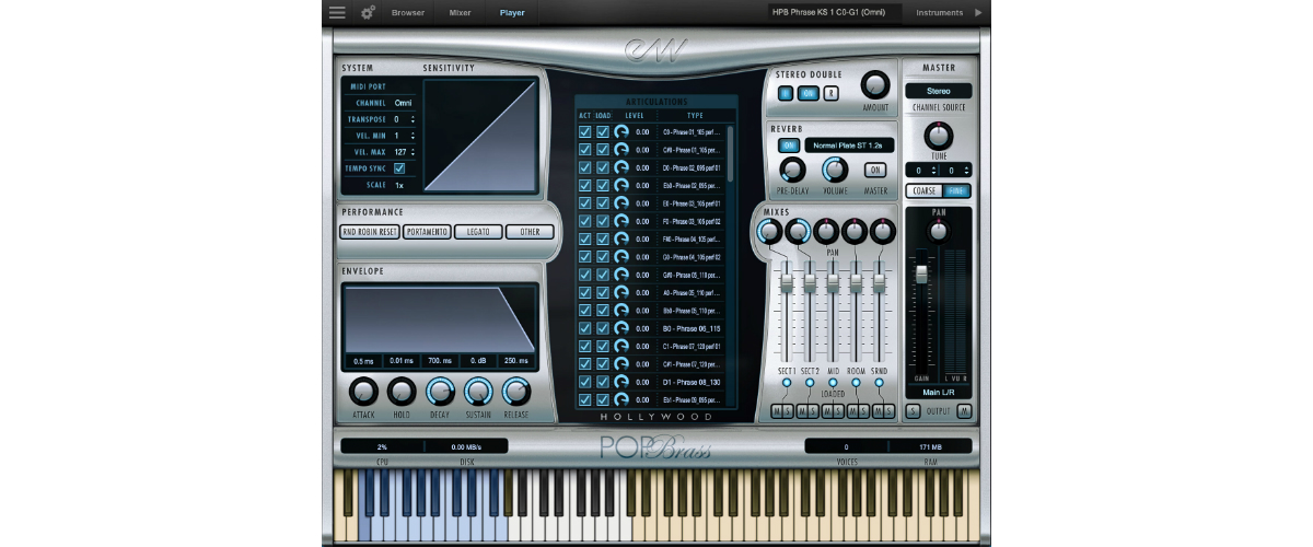 Hollywood Pop Brassは、ライブ ミュージシャンの生のエネルギーと、お気に入りのレコードで聴こえるポップサウンドのような、ライブステージの雰囲気を捉えたデザインが施されています。2つのトランペット、トロンボーン、そして音域に応じてバリトン、テナー、アルト サックスを交互に奏でるサックスを含む、マルチサンプリング・アーティキュレーション用の 4ピース・ブラス・アンサンブルが特徴です。マルチサンプリングされた驚異的なサウンドのアンサンブル・セクションは、マイケル・ジャクソンのエンジニアであるブルース・スウェーデンが、「世界で最高のブラスレコーディング・ルーム」と評価するハリウッド拠点EASTWEST STUDIO 1で収録されました。