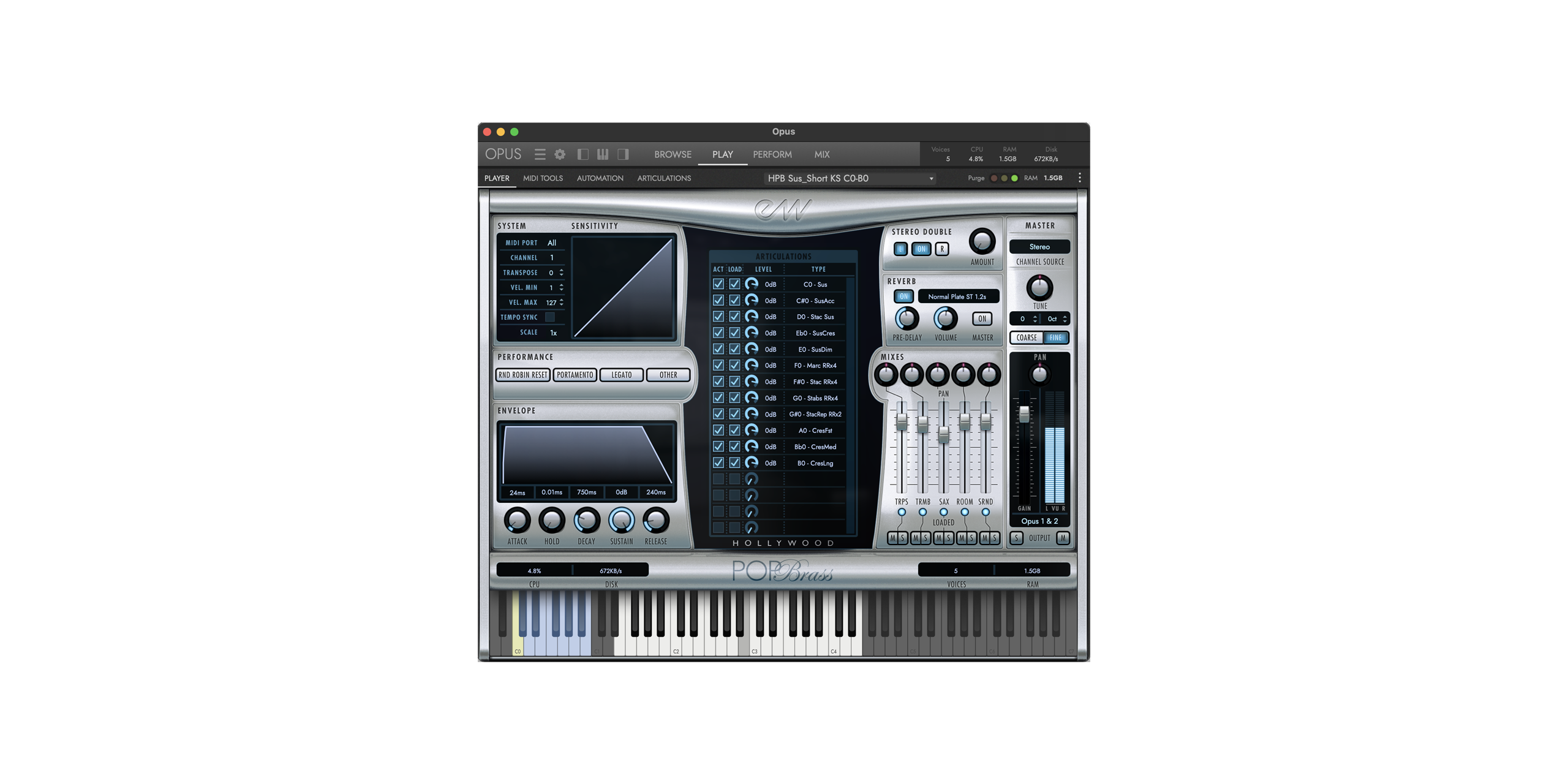 Hollywood Pop Brassは、ライブ ミュージシャンの生のエネルギーと、お気に入りのレコードで聴こえるポップサウンドのような、ライブステージの雰囲気を捉えたデザインが施されています。2つのトランペット、トロンボーン、そして音域に応じてバリトン、テナー、アルト サックスを交互に奏でるサックスを含む、マルチサンプリング・アーティキュレーション用の 4ピース・ブラス・アンサンブルが特徴です。マルチサンプリングされた驚異的なサウンドのアンサンブル・セクションは、マイケル・ジャクソンのエンジニアであるブルース・スウェーデンが、「世界で最高のブラスレコーディング・ルーム」と評価するハリウッド拠点EASTWEST STUDIO 1で収録されました。