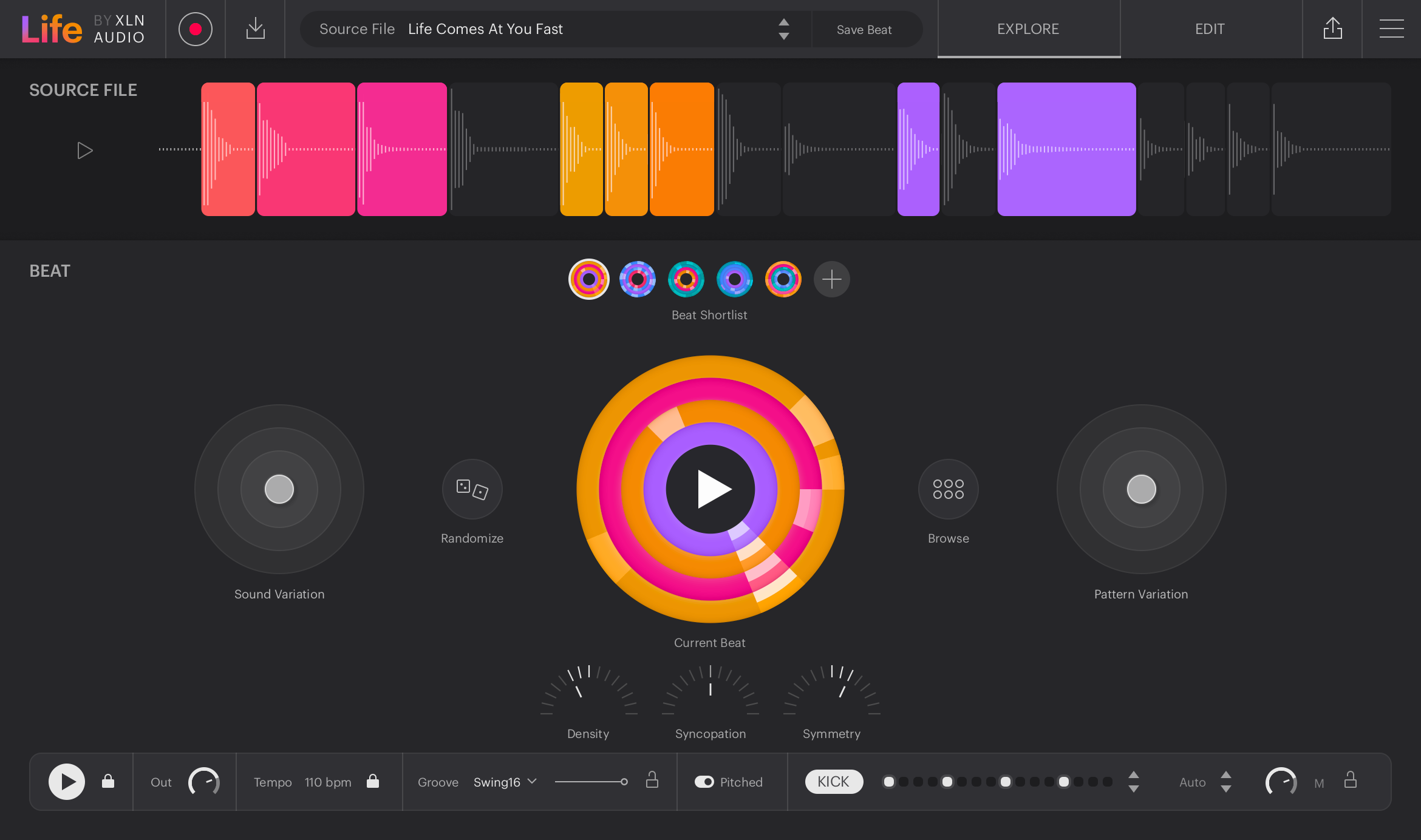 録音データを選択すると、Life By XLN Audio自身がビートを生成します。無限のバリエーションから成るビートを試聴し、気に入ったハッピーアクシデントを見つけて、チューニングを始めましょう。サウンド・バリエーションやパターン・バリエーションなどの機能を使ってビートを微調整したり、スライス・ポイントやFX、シーケンサーを編集して、さらに細部まで作り込みましょう。Life by XLN Audioの使いやすいワークフローは、機械学習モデルによって実現されており、ビート・バリエーションやサウンド・バリエーション、デンシティ、シンコペーション、シンメトリー・コントロールなどの機能が搭載されています。