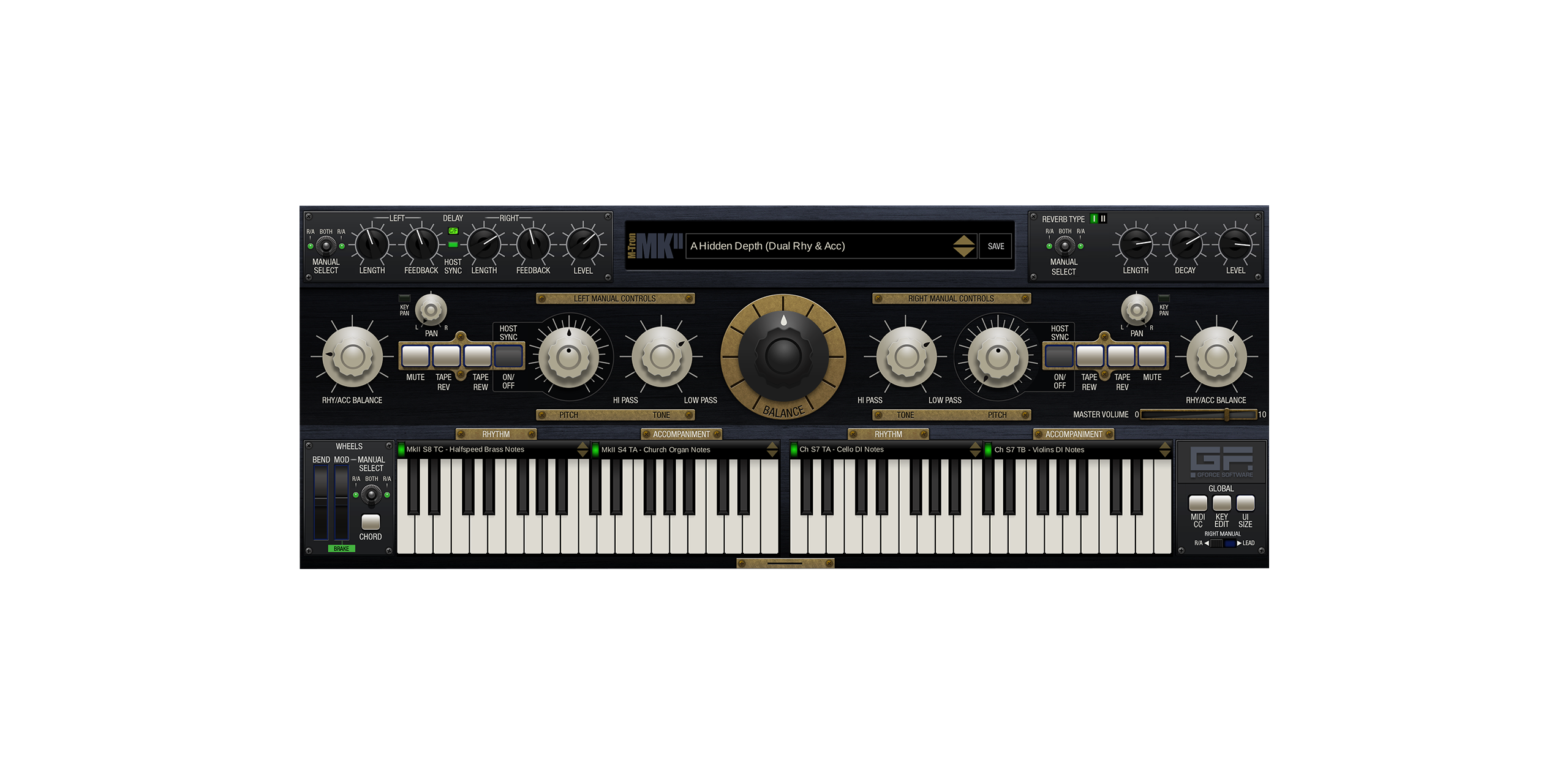 オリジナル・モデルのように、右のマニュアルはリードパートをロードします。また、オリジナルとは異なる点としてRhythm&をロードするためにRight Manualを拡張。 リズムとモチーフのハイブリッドな融合を作成するための伴奏を実現します。