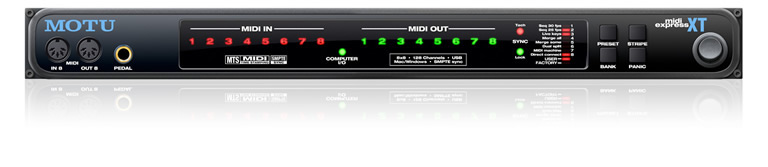 MIDI Express XT USBには、定評のあるMOTU MIDIインターフェイスの機能をすべて網羅し、さらにMIDIパッチベイやマージャーなどのMIDI機能と、高精度のタイムコードシンクロナイザー機能を装備したプロフェッショナル機器です。