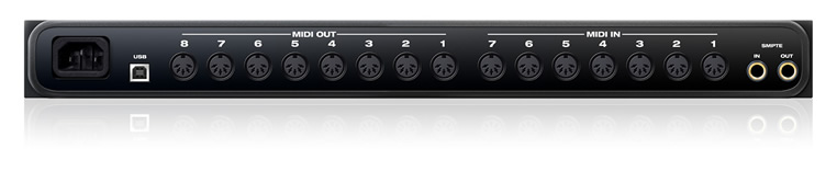 カスタム設計のVLSIテクノロジーを採用 フロントパネルのボタン操作とLED表示によるによるプリセットアクセス(8ファクトリー + 8ユーザー) SMPTEストライプボタン SMPTEの状態(ロック/Lockと速度/Tach)を確認できるLED表示 MIDI入出力とコンピューターの信号状況を確認するインジケーターをポートごとに装備 パニック(Panic)ボタン 17のMIDI端子(8入力、9出力) SMPTE入力と出力端子(1/4"フォーン) ペダル入力端子(1/4"フォーン、モメンタリー式フットスイッチ対応) IEC電源コネクター