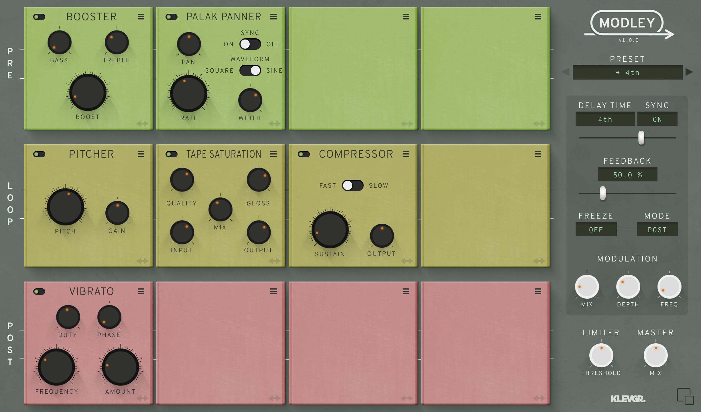 Modleyは、エフェクトインサート機能を備えたモジュレーション・ディレイです。慎重に選択された様々なエフェクトモジュールを駆使してディレイ信号全体をデザインし、独自のシグナルフローを作成できます。 Modleyの背景にある考え方としては、ディレイエフェクトの能力の限界を押し上げることで、ユーザーの想像力によって可能性は無限大に存在します! Modleyは、ステレオディレイ、テープディレイ、ショートスラップバックディレイなど、従来のすべてのトリックを実行するために使用できますが、その真の可能性は、適用できるさまざまな予期しないエフェクトモジュール内に存在しています。