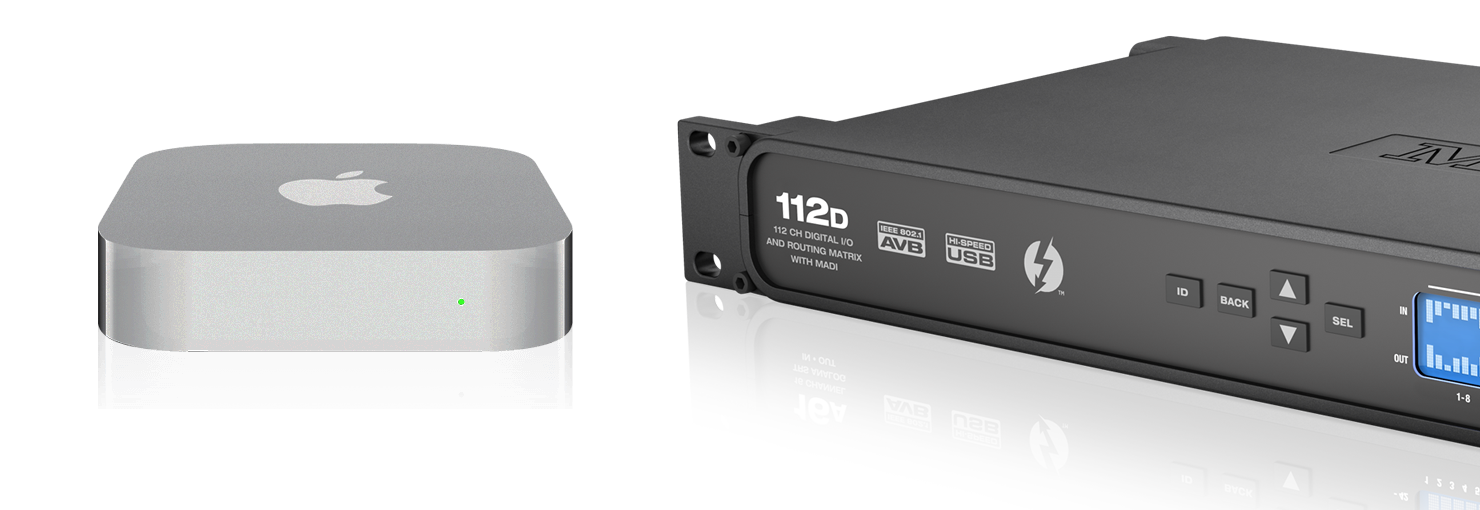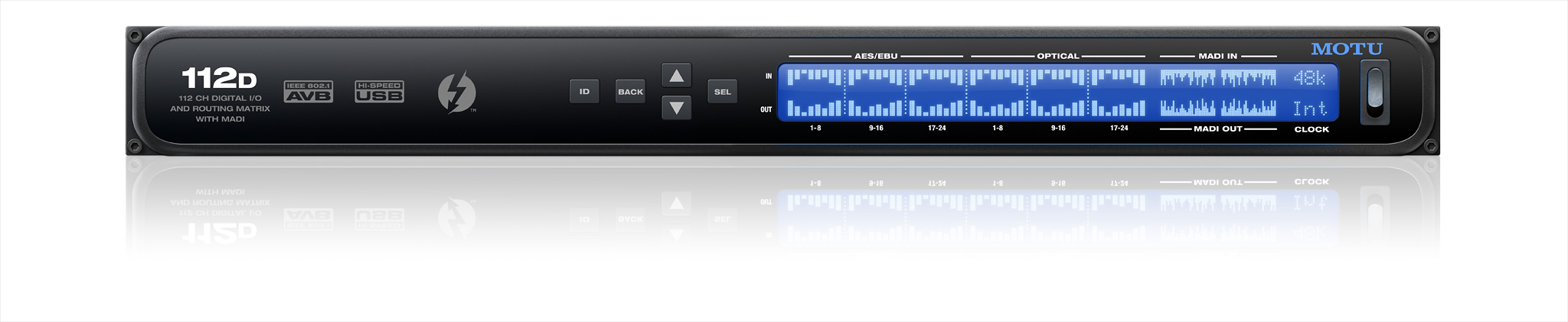 112Dに搭載されたThunderbolt端子は、112Dだけでなくコンピュータのディスプレイや、ハードドライブ、その他の周辺機器を接続しても問題なく動作する帯域幅を備えています。しかし、もっとも重要なのは、最大256チャンネル(128イン / アウト)のオーディオ入出力を可能にすることです。 112Dは、ハードウェアに搭載された入出力に加え、48チャンネルのソフトウェアミキサー、AVBネットワークストリームで、この256チャンネルを全て使用することができます。 112Dは、AVBオーディオネットワーキングとMADIをThunderbolt に統合した最速のインターフェイスです。