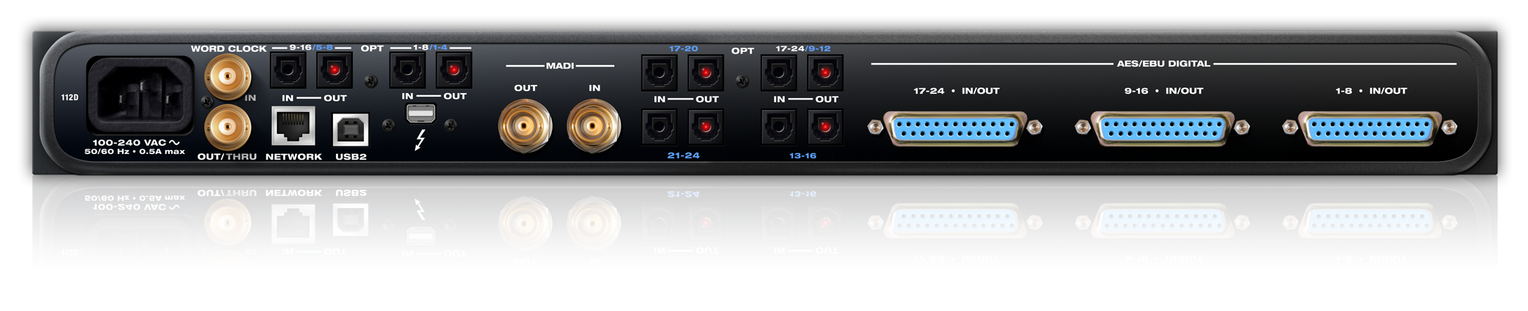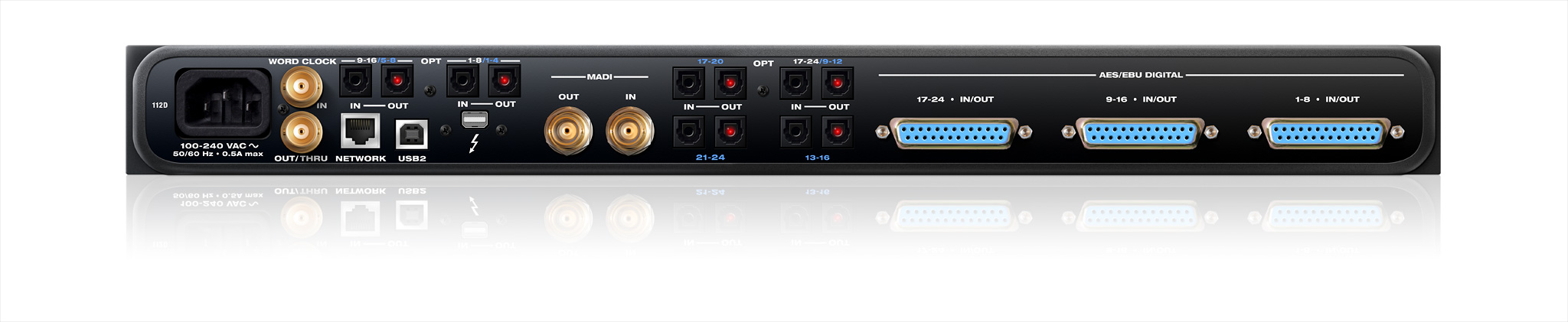 112x112入出力  AES/EBUx24(D-sub)MADI In&OutADAT optical x3Word Clock In&Out、Thunderbolt/USB 3.0/AVBイーサネット接続