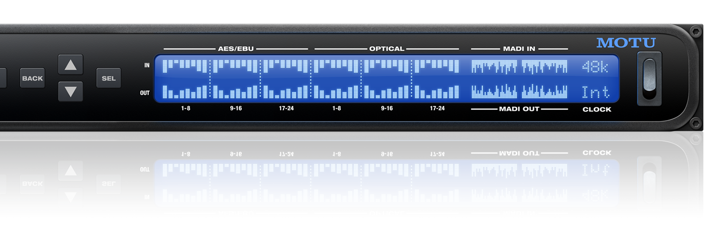 112Dは大型バックライト付き324×24液晶ディスプレイを搭載し、全てのアナログ・デジタル入出力の信号の状態を一目で確認できます。また、シンプルで便利なメニューから、ハードウェアの設定も可能です。