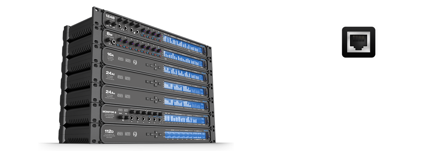 112Dに搭載されたネットワークポートは、AVBイーサネット(IEEEによって開発されたオーディオネットワーキングのための新しいプロトコル)を導入しています。 CAT-5eあるいはCAT-6 イーサネットケーブルでMOTU AVBインターフェイス(1248、8M、16A)を接続するだけで拡張が可能です。