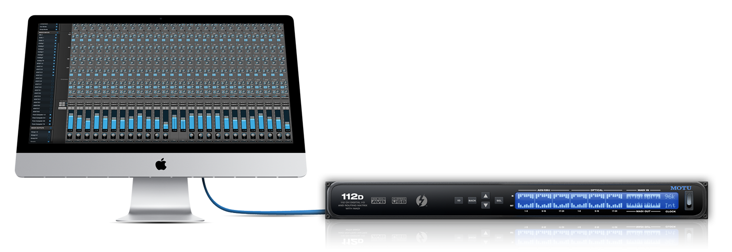 112Dはワンクリックであらゆるインプット、アウトプットにデジタルオーディオをコンピューターやAVBネットワークにルーティングすることができます。
