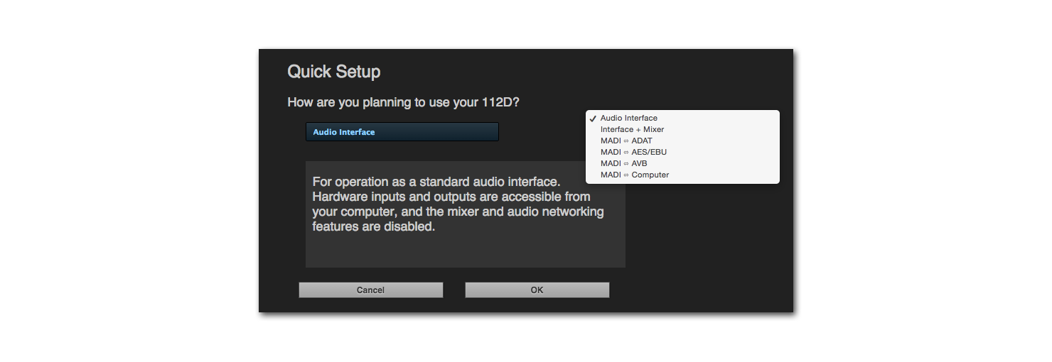 112Dは非常に柔軟な設定が可能で、ステージやスタジオなど、多くの場面で活躍することでしょう。 クイックセットアップメニューは様々な状況を想定したプリセットを搭載し、標準的なオーディオインターフェイスとしての設定から、ネットワーク上のデバイスとしての設定まで、瞬時に112Dを再構成します。 もちろんルーティングやミキサーの設定など、ご自身のニーズに合わせてカスタマイズし、プリセットとして保存することも可能です。