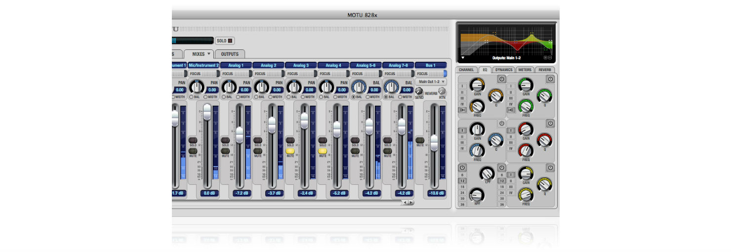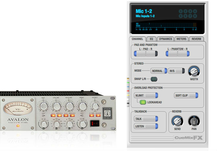 828xにはミキシング、モニタリング、ライブミキシング用エフェクト(EQとリバーブ)を搭載したCueMix FXが付属します。