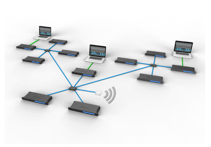 もしレコーディングでのサブミックスやモニターミックスを作る必要がとき、または外部エフェクトを使う必要があるときは、ミキサーを使ってルーティングとミックスを行うことができます。そしてミックスは単体のみならず、ネットワーク経由で接続したAVBインターフェイスとの間で「AVBカスケード Bus」を作ることで、複数のAVBインターフェイスを1つのオーディオI/Oとして使うことができます。