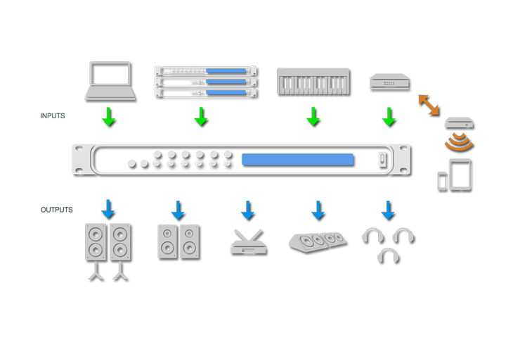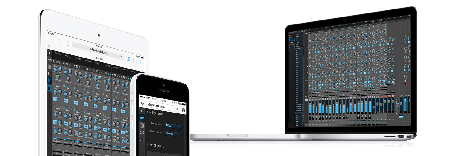 Monitor 8をコントロールするソフトウェアは、ハードディスク上に存在しません。 Monitor 8は、ハードウェアと連動するWebアプリケーションでコントロールします。 これは、Monitor 8の内蔵DSPエフェクトやミキサー、デバイスの各種設定、ルーティングなどを、有線または無線(Wi-Fi)によって接続されたローカル・エリア・ネットワーク内のラップトップ、タブレットあるいはスマートフォン上で、お好きなウェブブラウザを使用してコントロールできることを意味しています。 同じネットワークを共有している限り、任意のプラットフォーム(Mac、Windows、Linux、iOS、アンドロイド)で、任意のウェブブラウザを使用することができます。