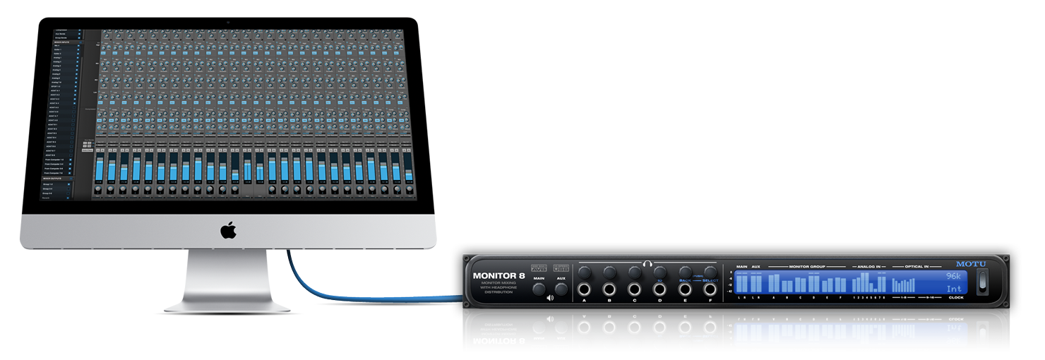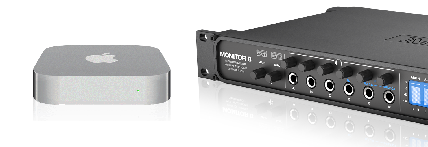 USB接続に変わるオーディオインターフェイスを探していませんか?もしmacOS10.10、10.11を搭載したMacをお持ちなら『AVBイーサネット』という選択肢があります。 Monitor 8は、Macと直接スタンダードなCAT-5eイーサネットケーブルで接続するだけで(最長100m)、すべてのCore Audioに対応したホストアプリケーションで使用可能なオーディオインターフェイスになります。
