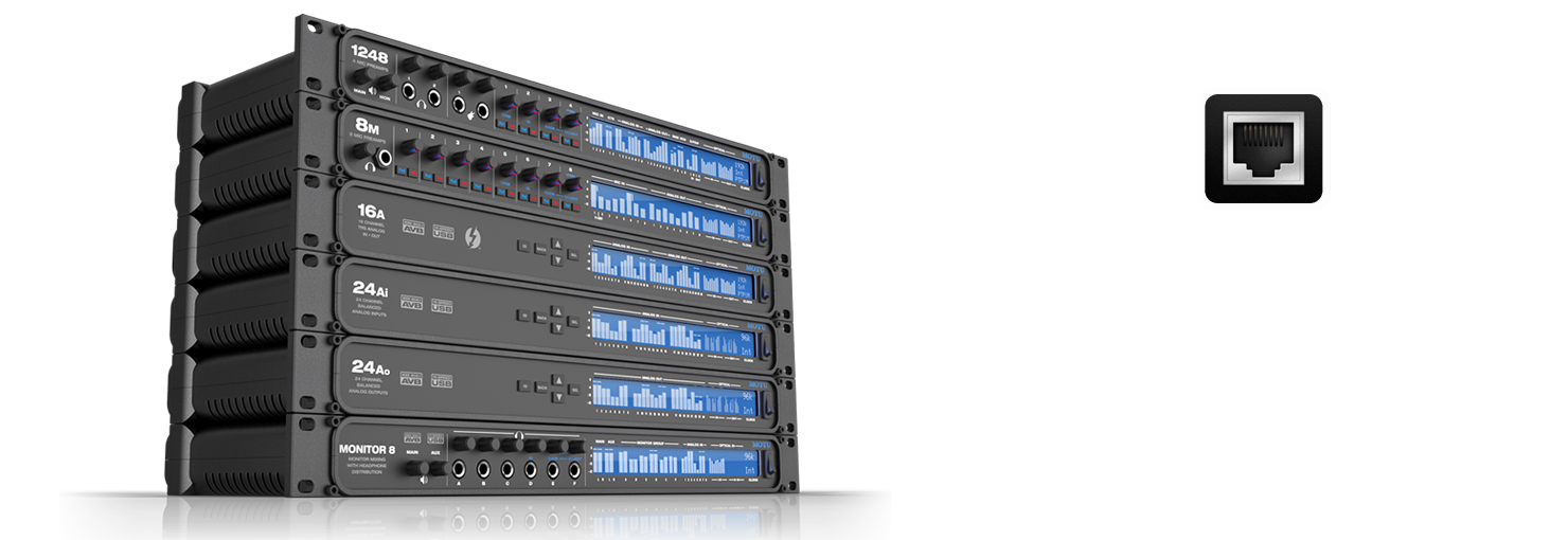 Monitor 8に搭載されたネットワークポートは、AVBイーサネット(IEEEによって開発されたオーディオネットワーキングのための新しいプロトコル)を導入しています。 CAT-5eあるいはCAT-6 イーサネットケーブルでMOTU AVBインターフェイス(1248、8M、16A)を接続するだけで拡張が可能です。