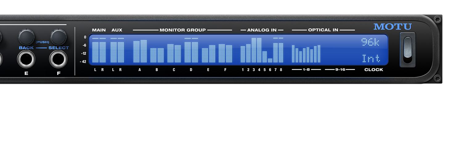 Monitor 8は大型バックライト付き324×24液晶ディスプレイを搭載し、全てのアナログ・デジタル入出力の信号の状態を一目で確認できます。また、シンプルで便利なメニューから、ハードウェアの設定も可能です。