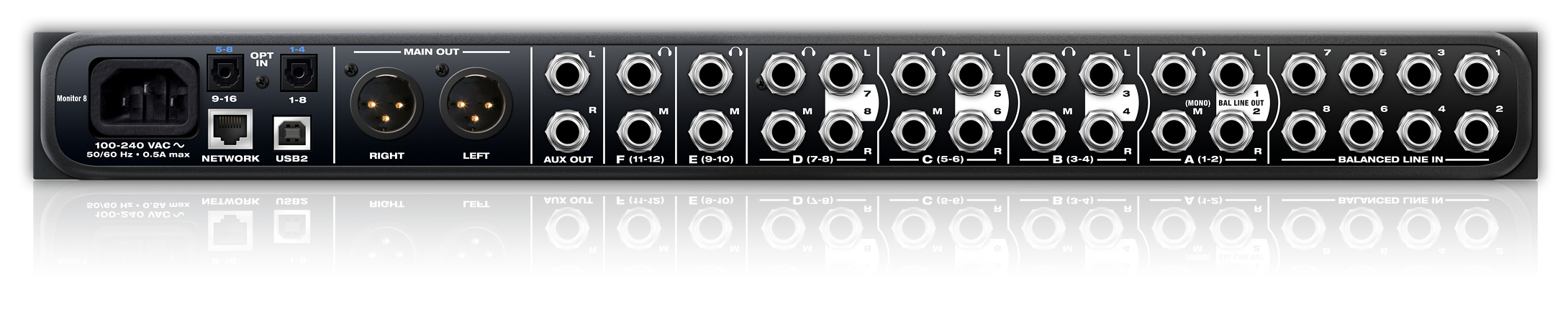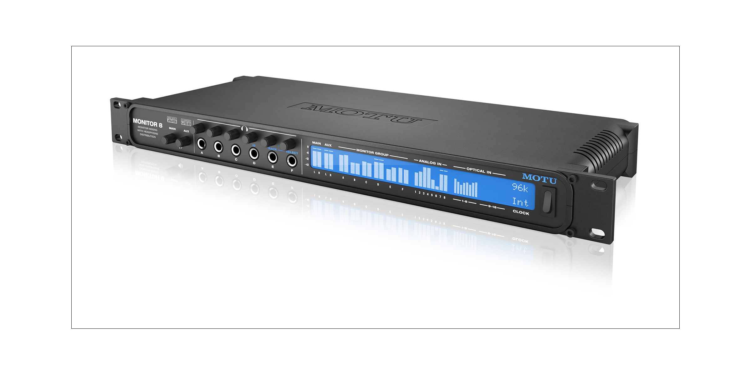 Monitor 8は、24インプット、8ステレオグループアウト、6基のヘッドホンアンプを搭載したUSB/AVBオーディオインターフェイスです。